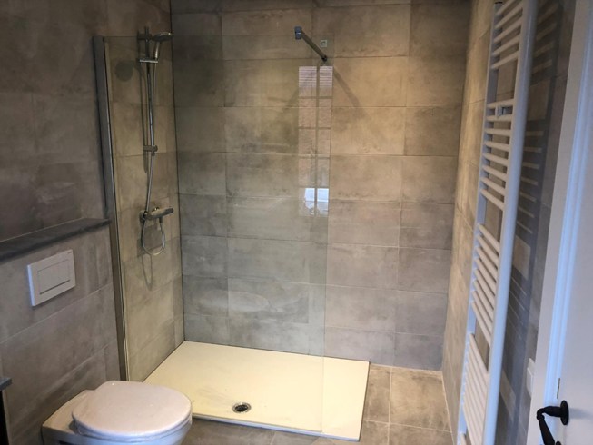 1ste verdiep: 1 grote slaapkamer, 1 badkamer met inloopdouche, lavabo.