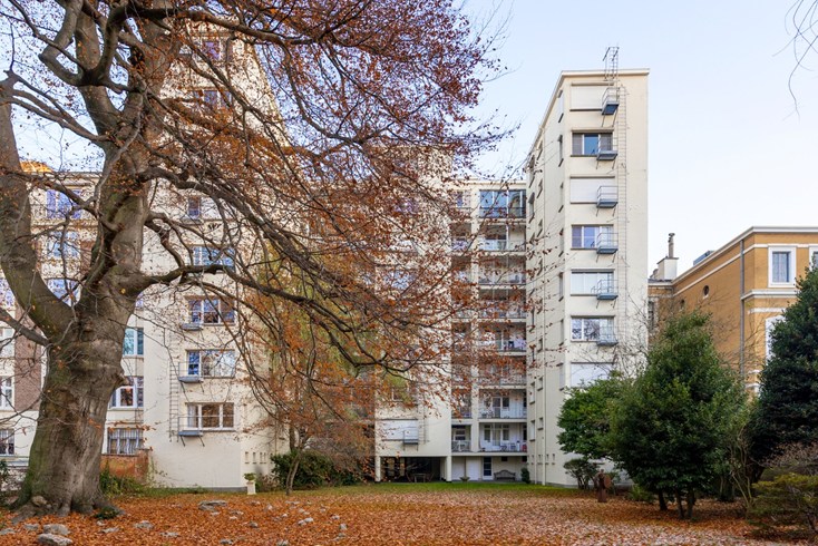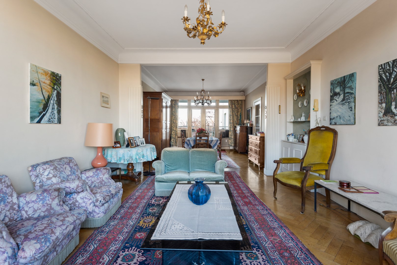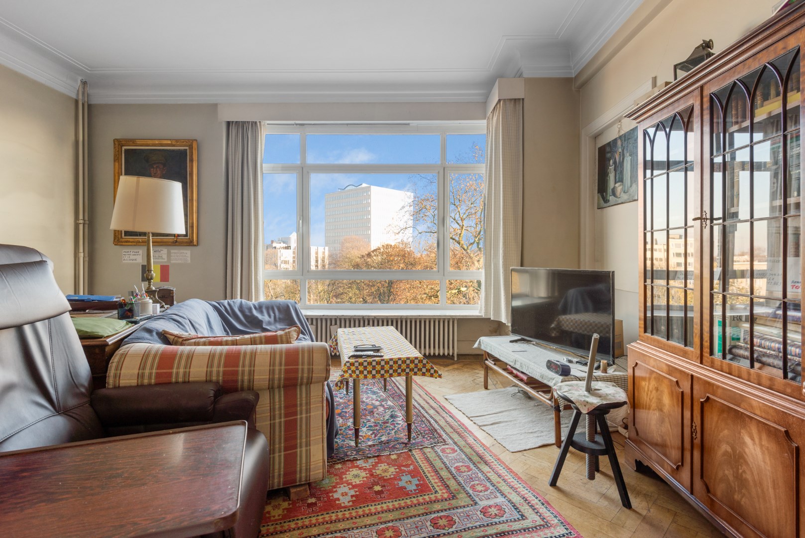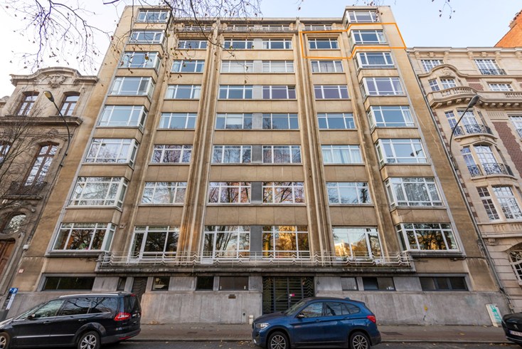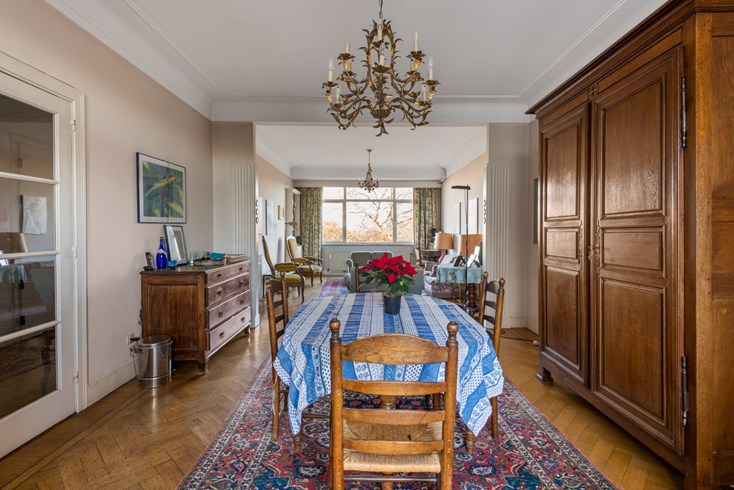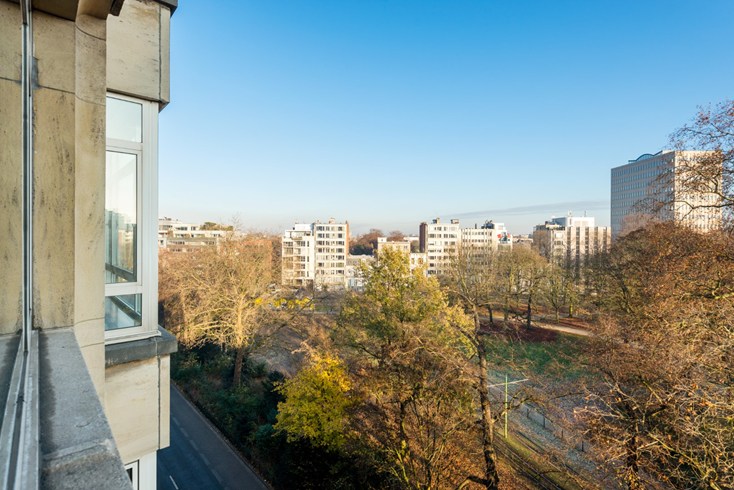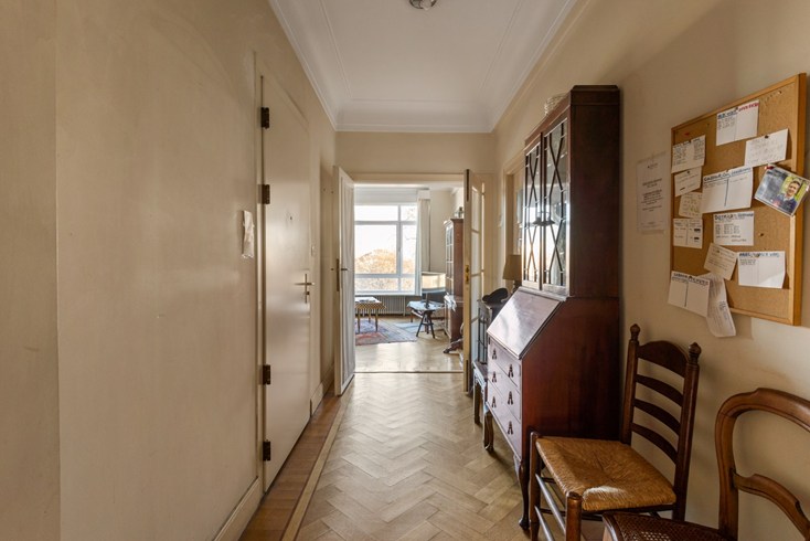 Het appartement is gelegen op de 7de verdieping van een zeer goed onderhouden Art deco gebouw. Dit merk je alvast op bij het binnenkomen. Na de lift genomen te hebben wordt er toegang verleend via een gepantserde deur die je brengt in de hal. Een appartement waar je doorheen moet kijken en je vooral moet focussen op de vele lichtpartijen die aanwezig zijn. Vooraan heb een fenomenaal zicht op het park alsook heb je achteraan het gebouw een mooi zicht op een deeltje van de 'Koekenstad'.