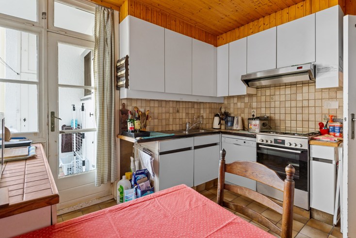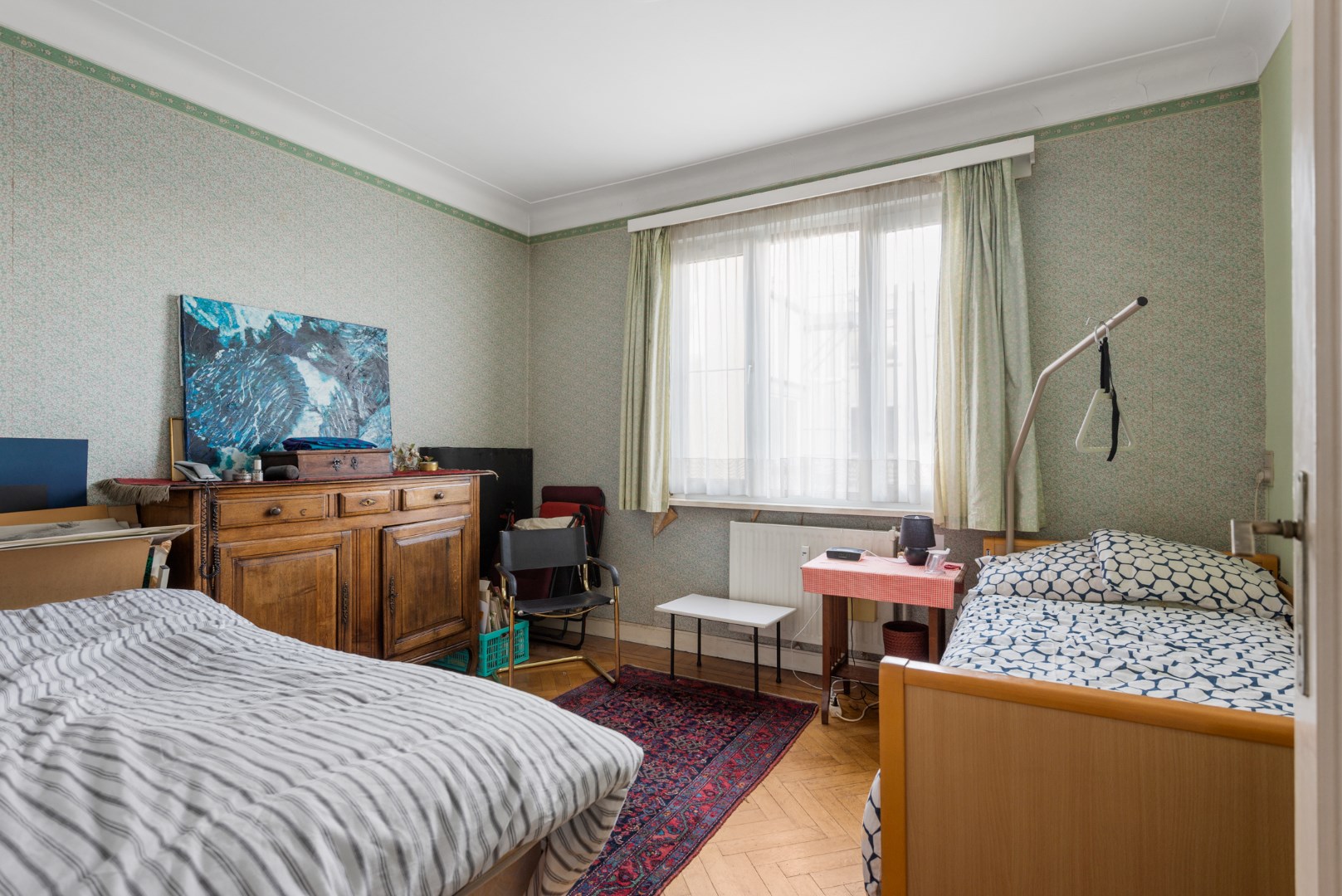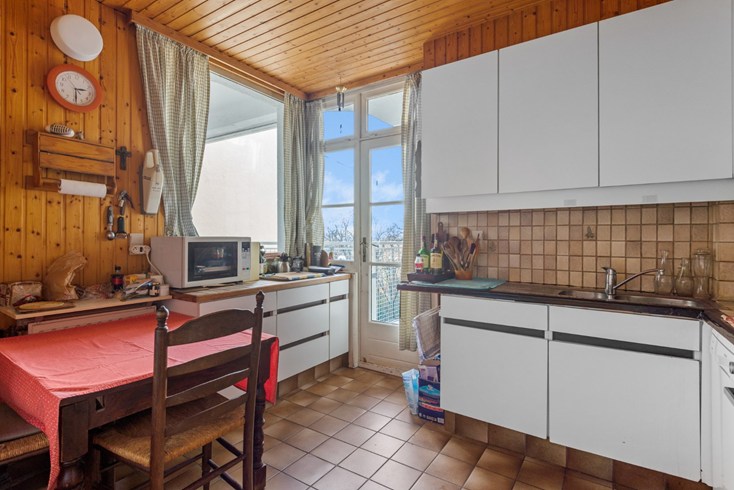 Mooie centrale inkomhal met vestiaire welke toegang verschaft tot verschillende kamers, enerzijds een voorkamer die ingericht kan worden als slaapkamer of bureau, anderzijds de keuken/lichte leefruimte op parketvloer. Via de gang tref je nog 2 slaapkamers aan + 1 badkamer, mogelijks 2.