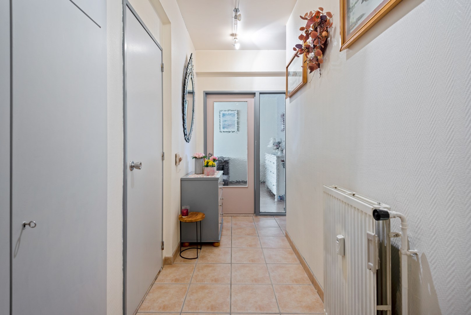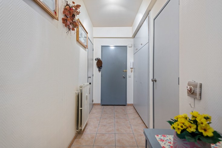 In de ruime inkomhal verschillende inbouw/vestiaire kasten.