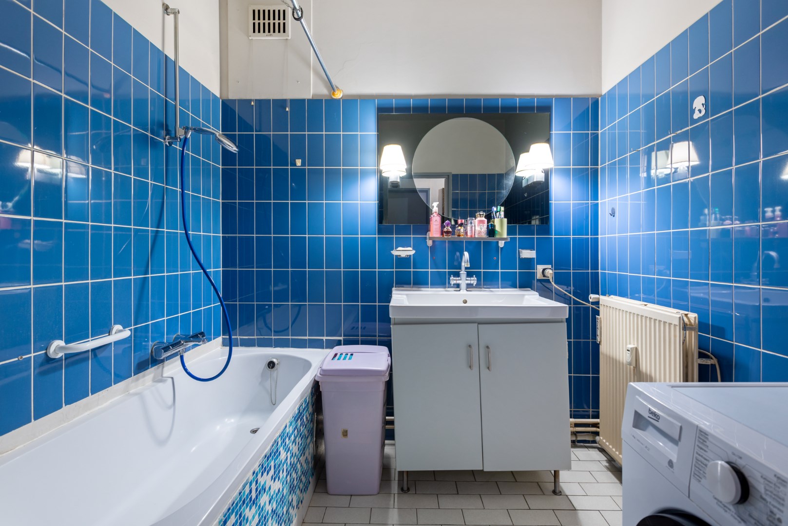 Een badkamer (5m²) met ligbad en lavabo, plaats voor wasmachine.