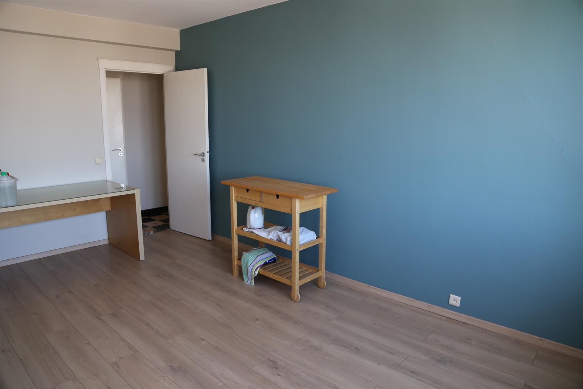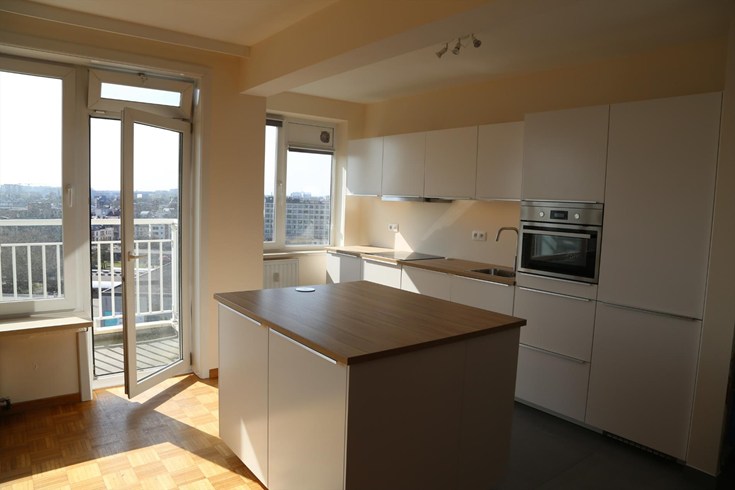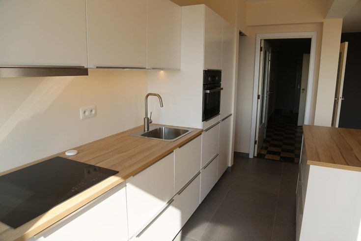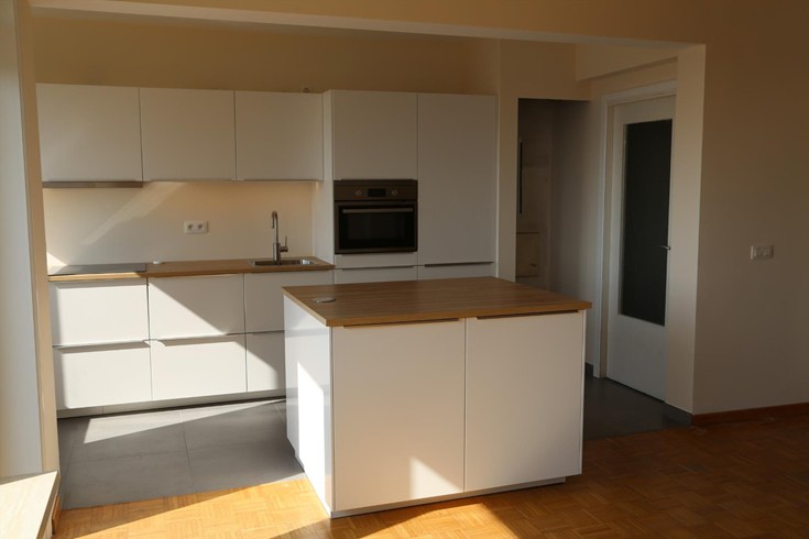 Zowel de gezellige woonkamer, met originele parketvloer als de volledig nieuwe open keuken met vaatwasmachine, koelkast, diepvriezer , oven en keramisch kookvuur, liggen aan het ruime, zuidgerichte, terras. Ook dit is enkele jaren geleden volledig vernieuwd en voorzien van verlichting en een buitenkraantje.
