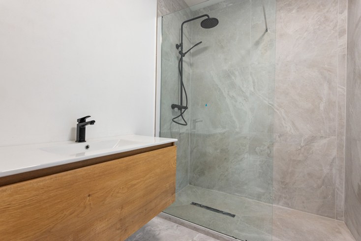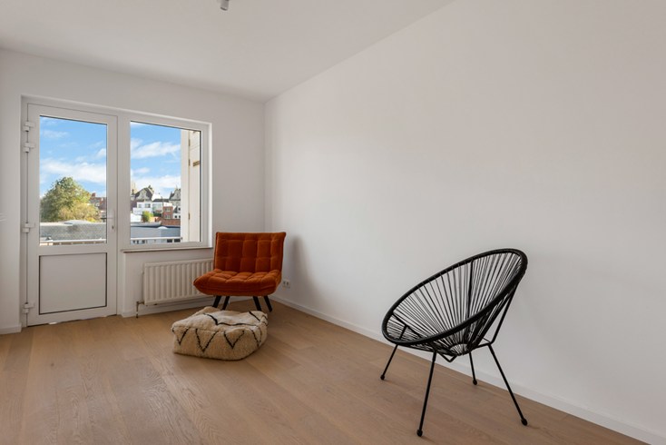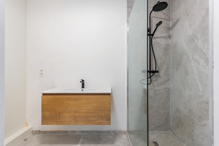 In het hele appartement ligt warme parket dat voor een groot gevoel van eenheid zorgt. Alleen in de badkamer werd om praktische redenen gekozen voor een tegelvloer. Naast de master-bedroom ligt de badkamer met een dubbele lavabo en een inloopdouche. Het toilet bevindt zich apart in de ruimte ernaast. Er is ook ruimte voor aansluiting wasmachine en droogkast.