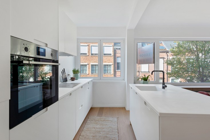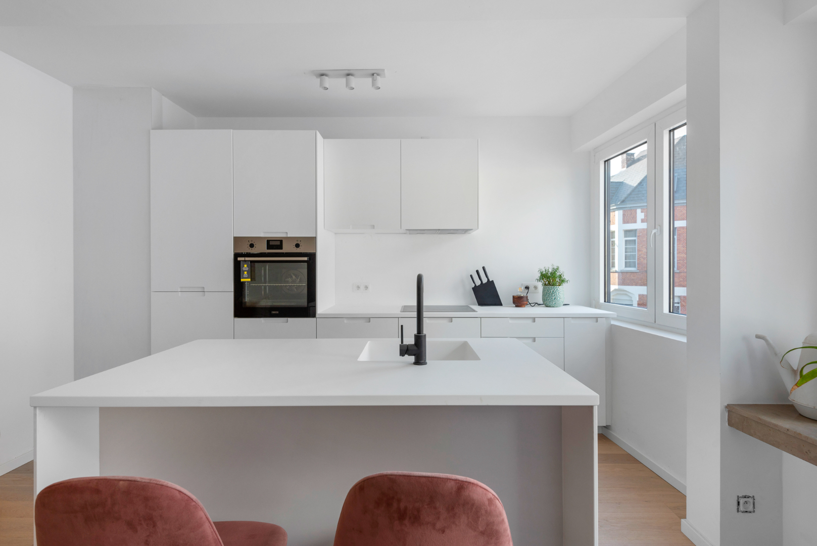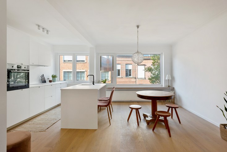 Je komt binnen in een ruime hall die opengemaakt is naar de grote leefruimte met een open volledige geïnstalleerde keuken. Aan licht geen gebrek, de grote ramen vangen de zon elke dag in keuken en leefruimte.