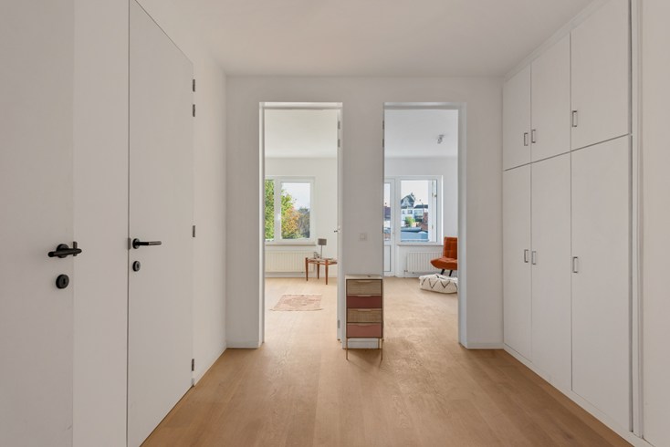 De andere kant van de hall geeft toegang tot de twee slaapkamers. De badkamer ligt in het midden van het appartement.