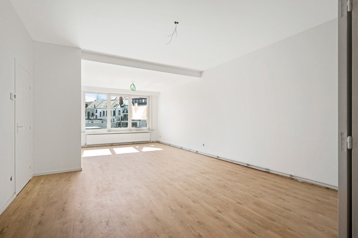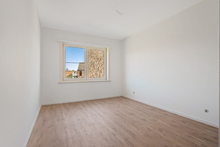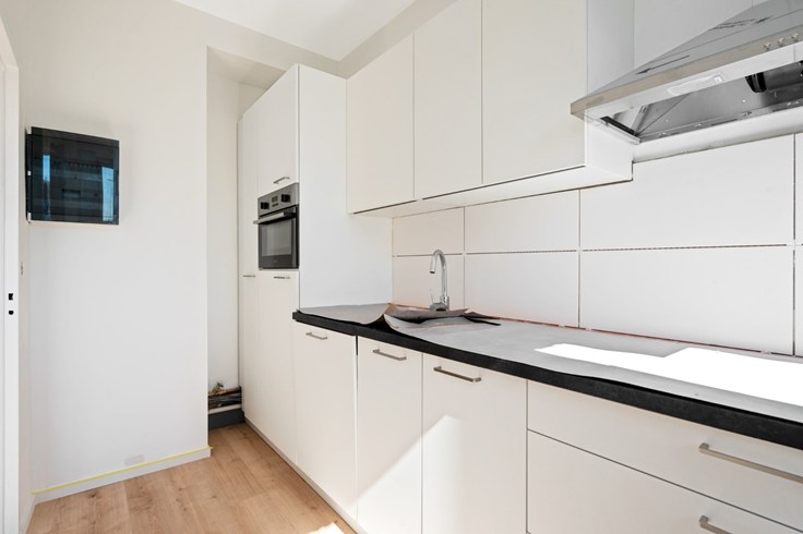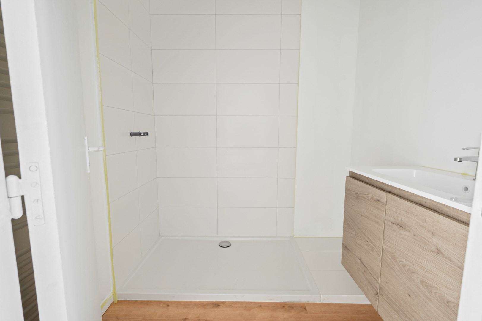 In het hele appartement ligt laminaat dat voor een groot gevoel van eenheid zorgt. Alleen in de badkamer werd om praktische redenen gekozen voor een vinyl vloer. De badkamer is voorzien van een enkele lavabo, radiator en een inloopdouche. Het toilet bevindt zich apart.