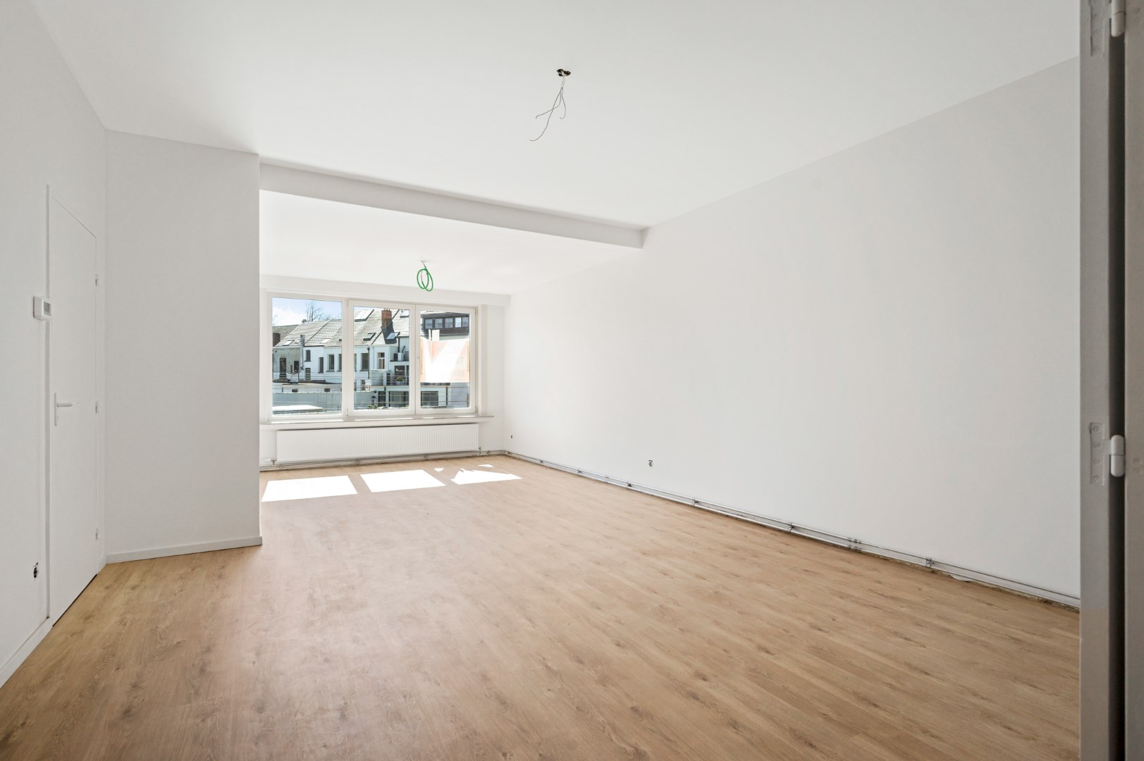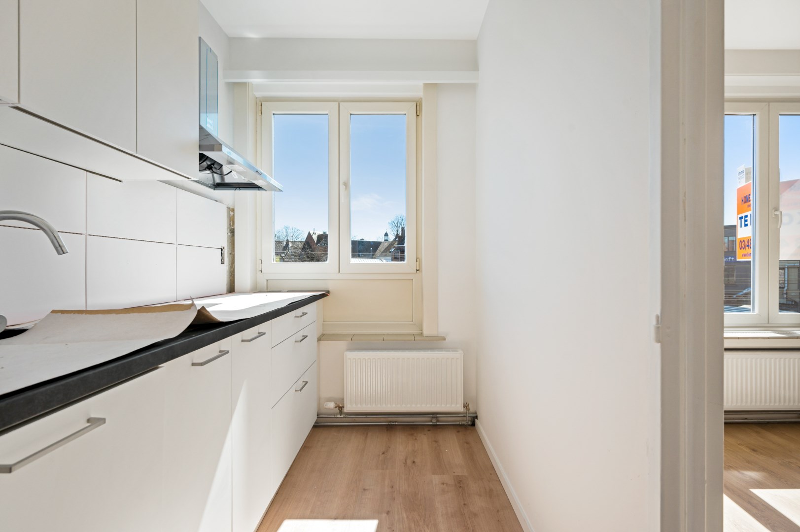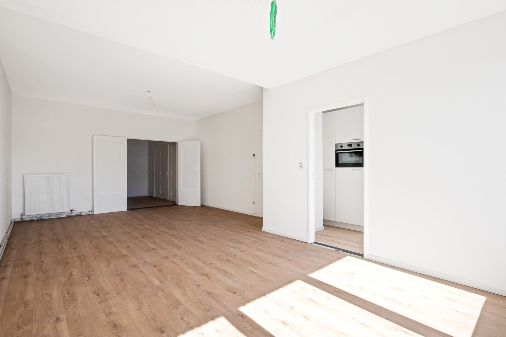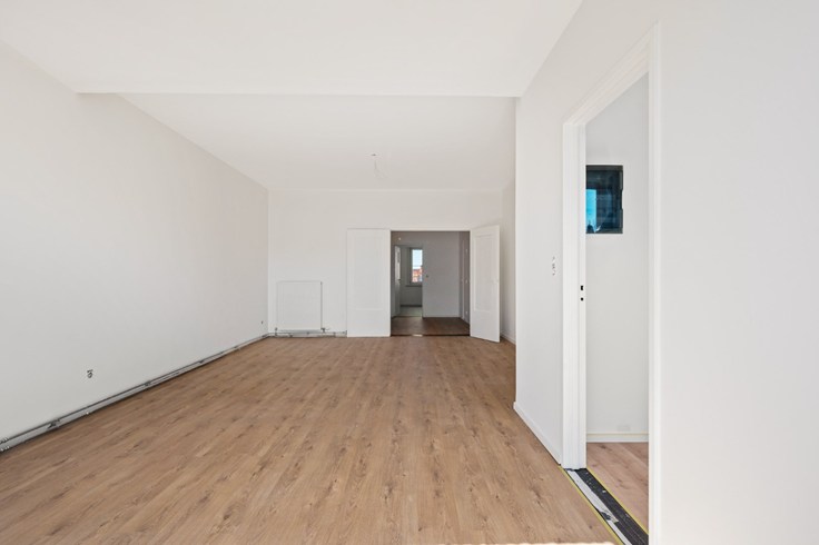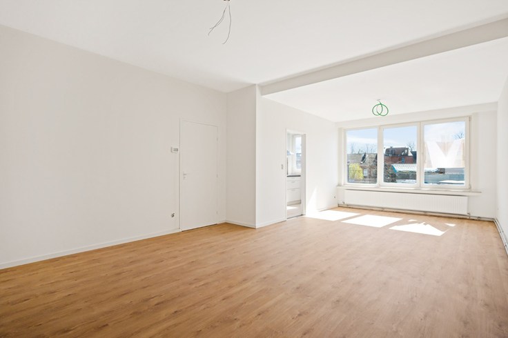 Je komt binnen in een ruime hall die zich situeert tussen de slaapvertrekken en woonruimte. Woonruimte grenst aan een volledige nieuwe geïnstalleerde keuken. Aan licht geen gebrek, de grote ramen vangen de zon elke dag in keuken en leefruimte.