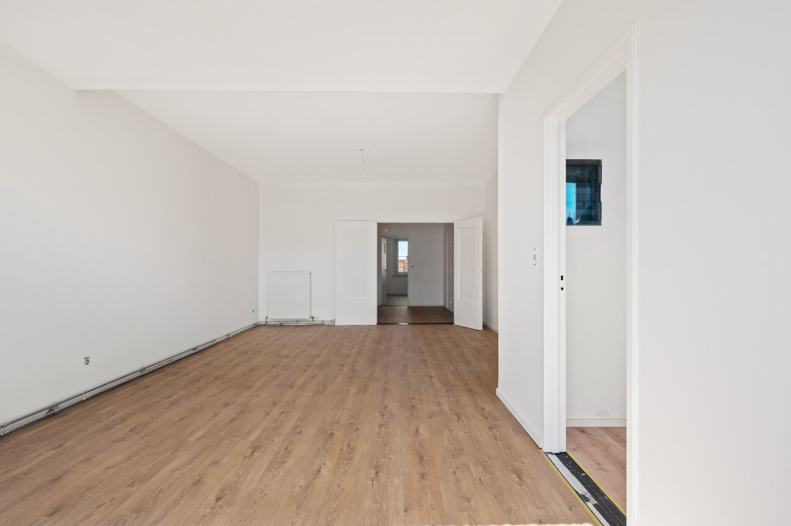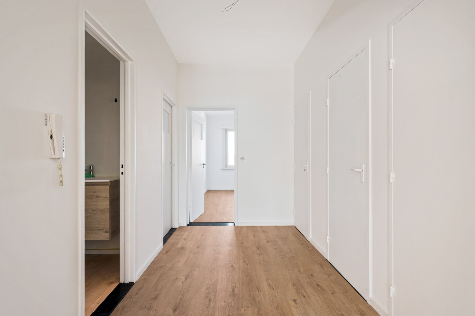 De andere kant van de hall geeft toegang tot de twee slaapkamers. De badkamer ligt in het midden van het appartement.