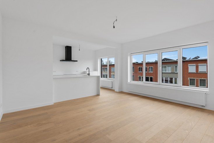 Een living met groot raamoppervlak ( licht ) en open keuken met kookeiland .