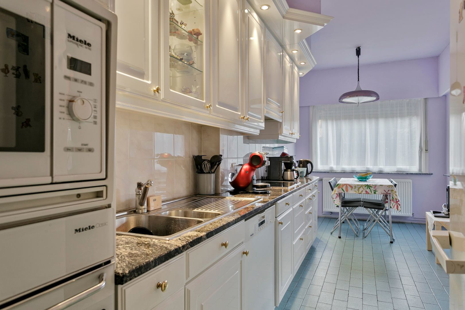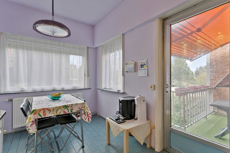 Keuken: Een kwalitatieve keuken uitgerust met: frigo, oven, microgolfoven en keramische kookplaat + dampkap. Aansluitend een eethoek en de toegang tot het zonnige terras met zonneluifel.