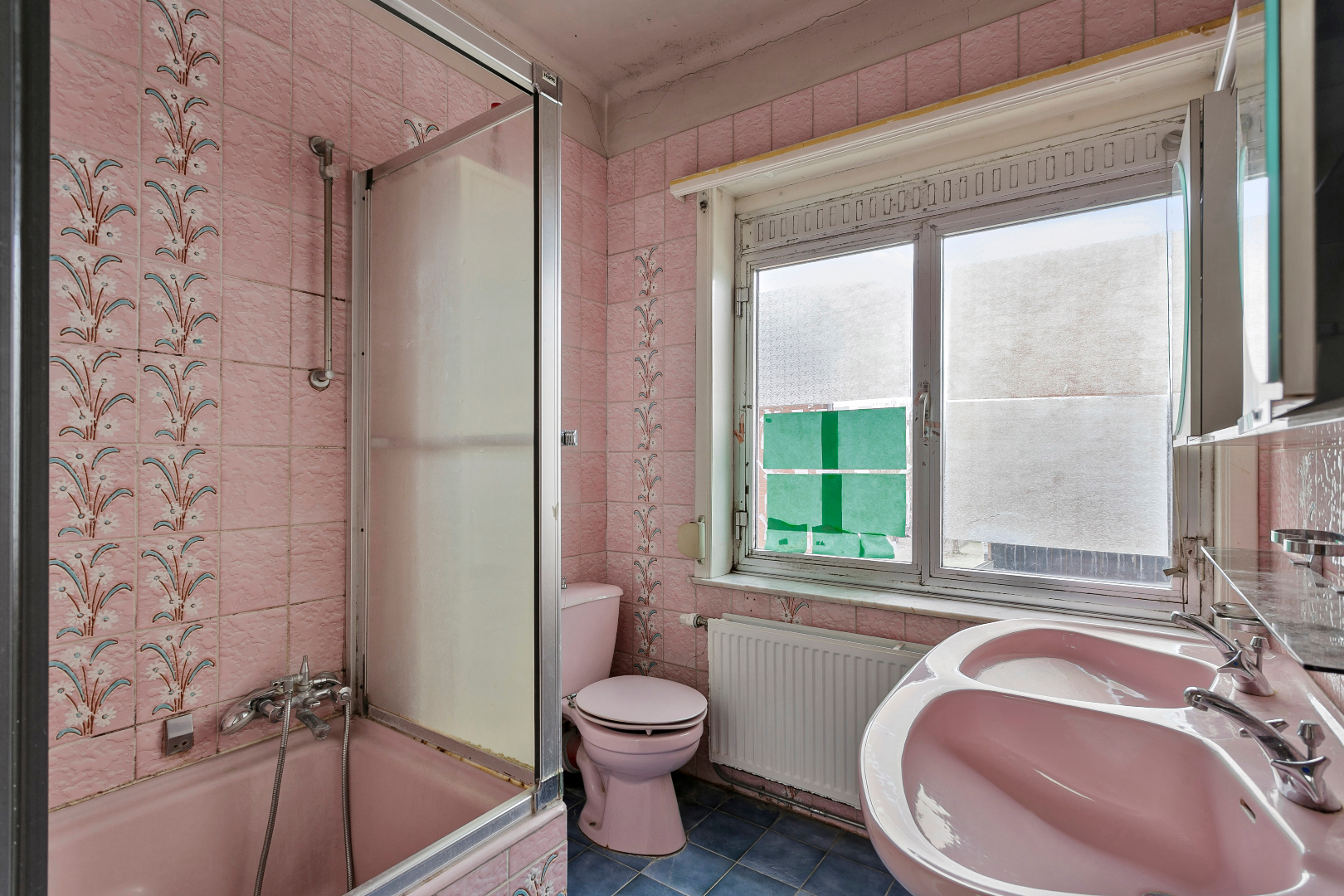 Badkamer: Een op te frissen badkamer met douche, toilet en wastafel.