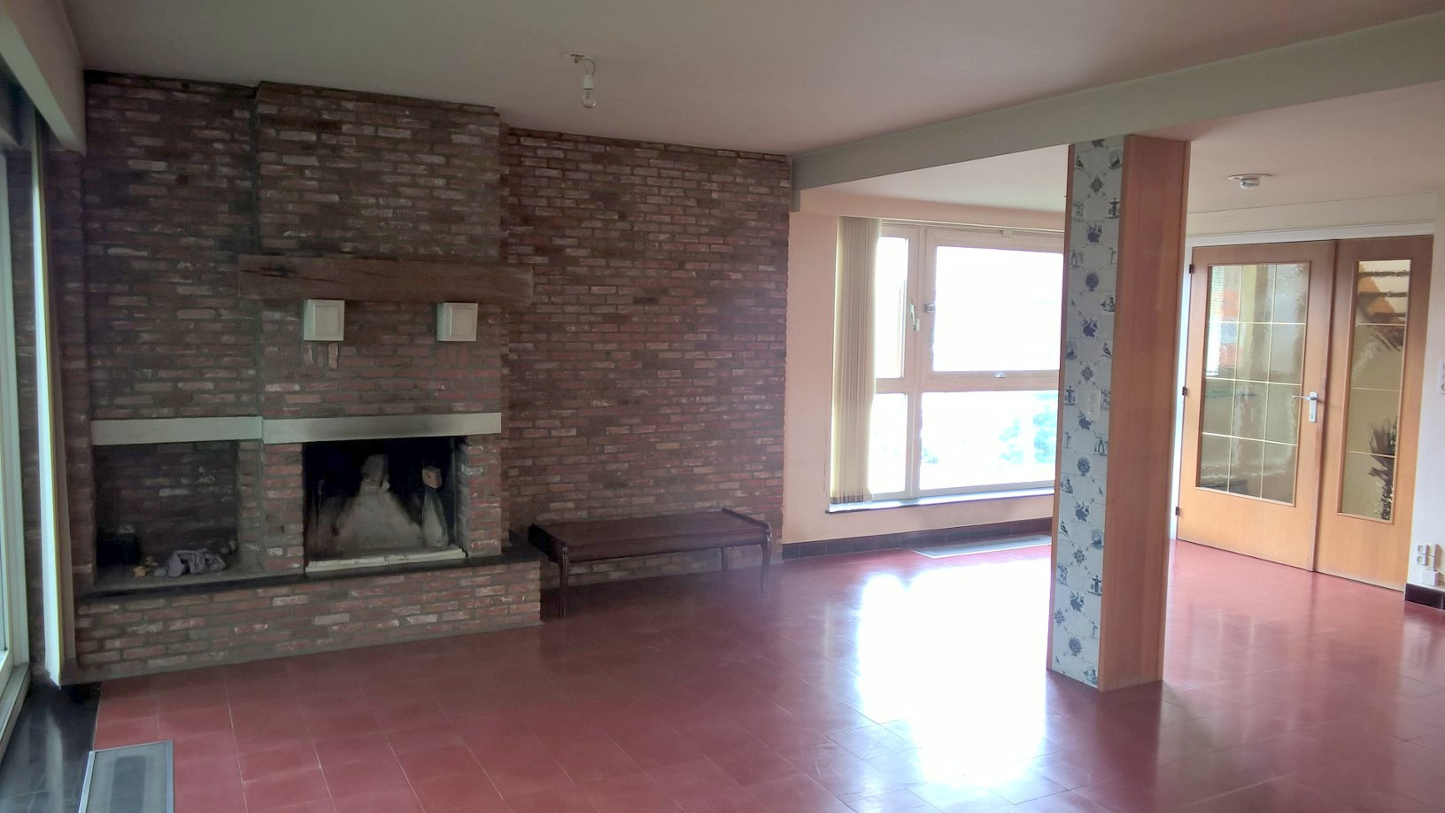 Op de eerste verdieping een grote living (41 m²) met open haard , een keuken ( 14 m² ) , een vestiaire en een gasten toilet.