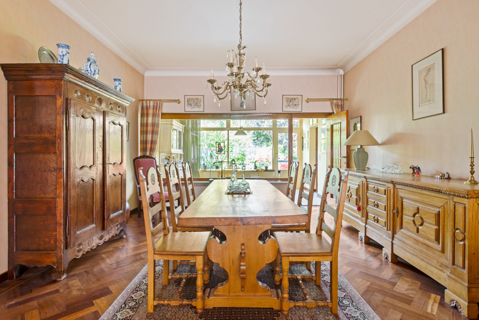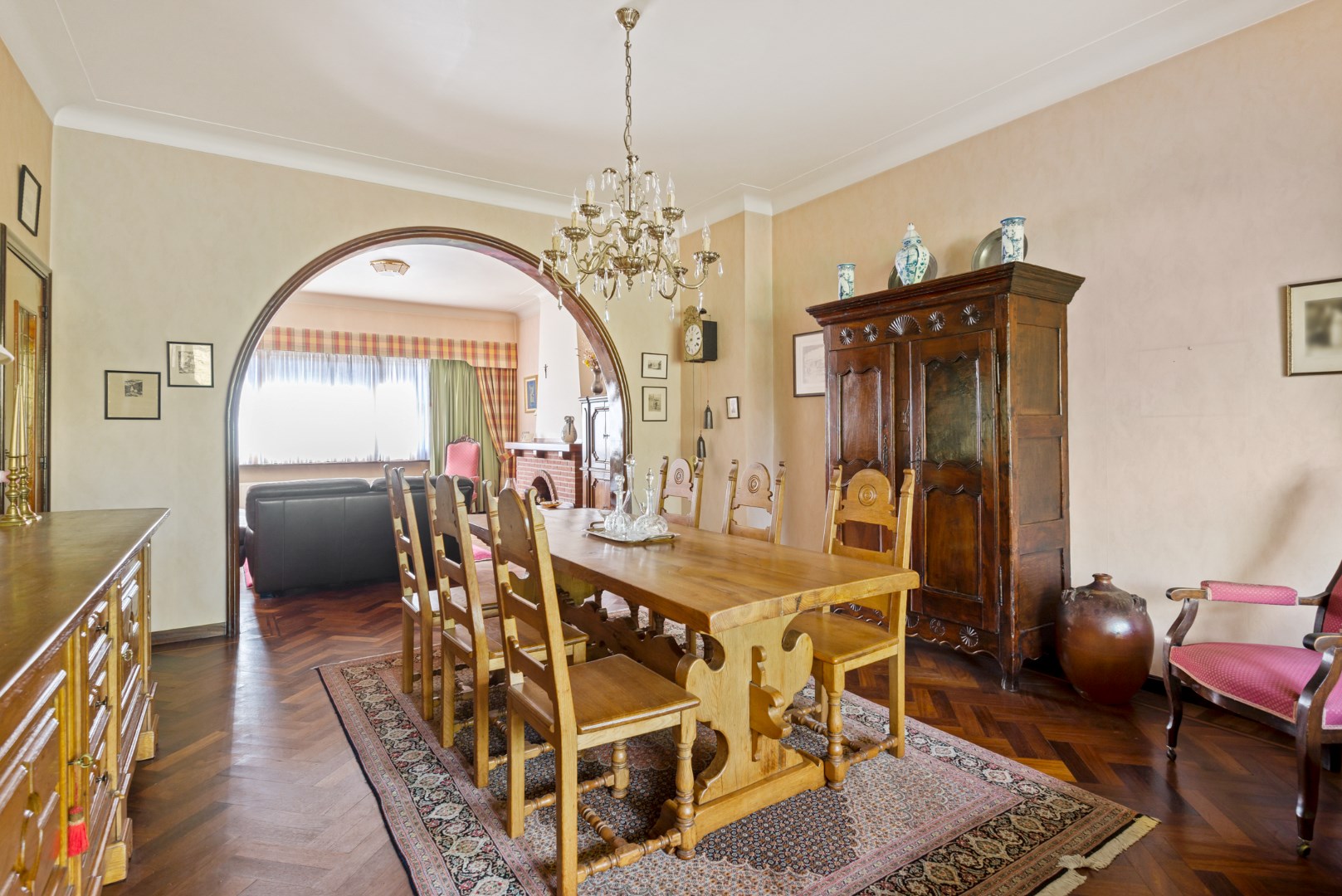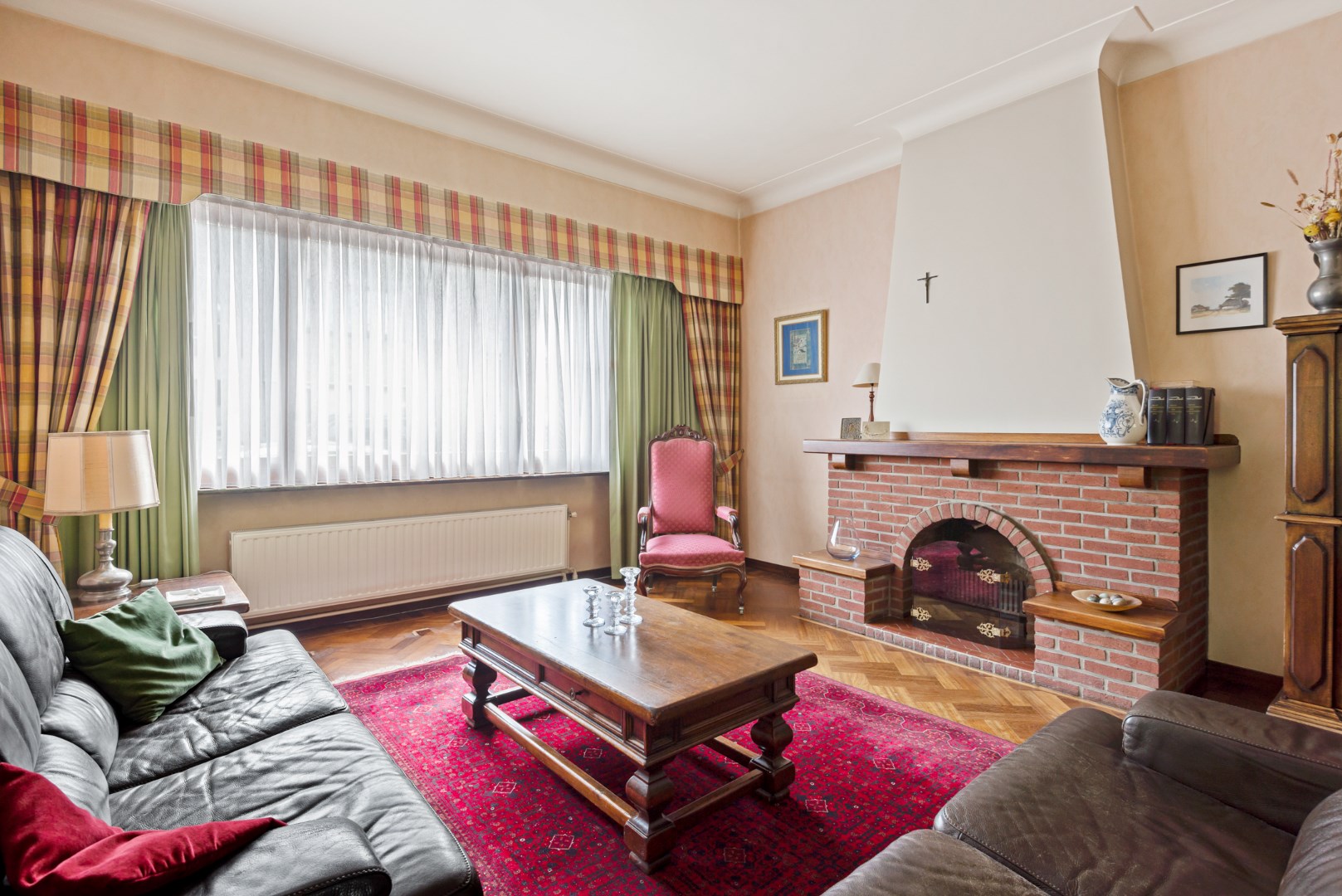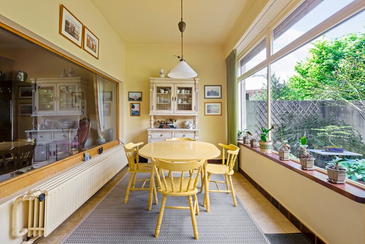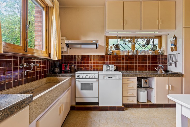 De originele keuken is behouden alsook het parket in de living met open haard.