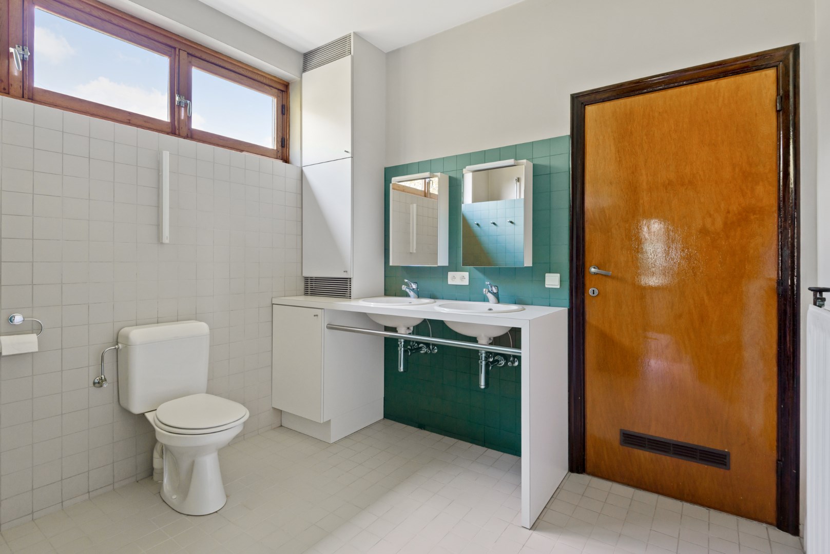 Een eenvoudige badkamer met inloop douche, dubbele lavabo en toilet.