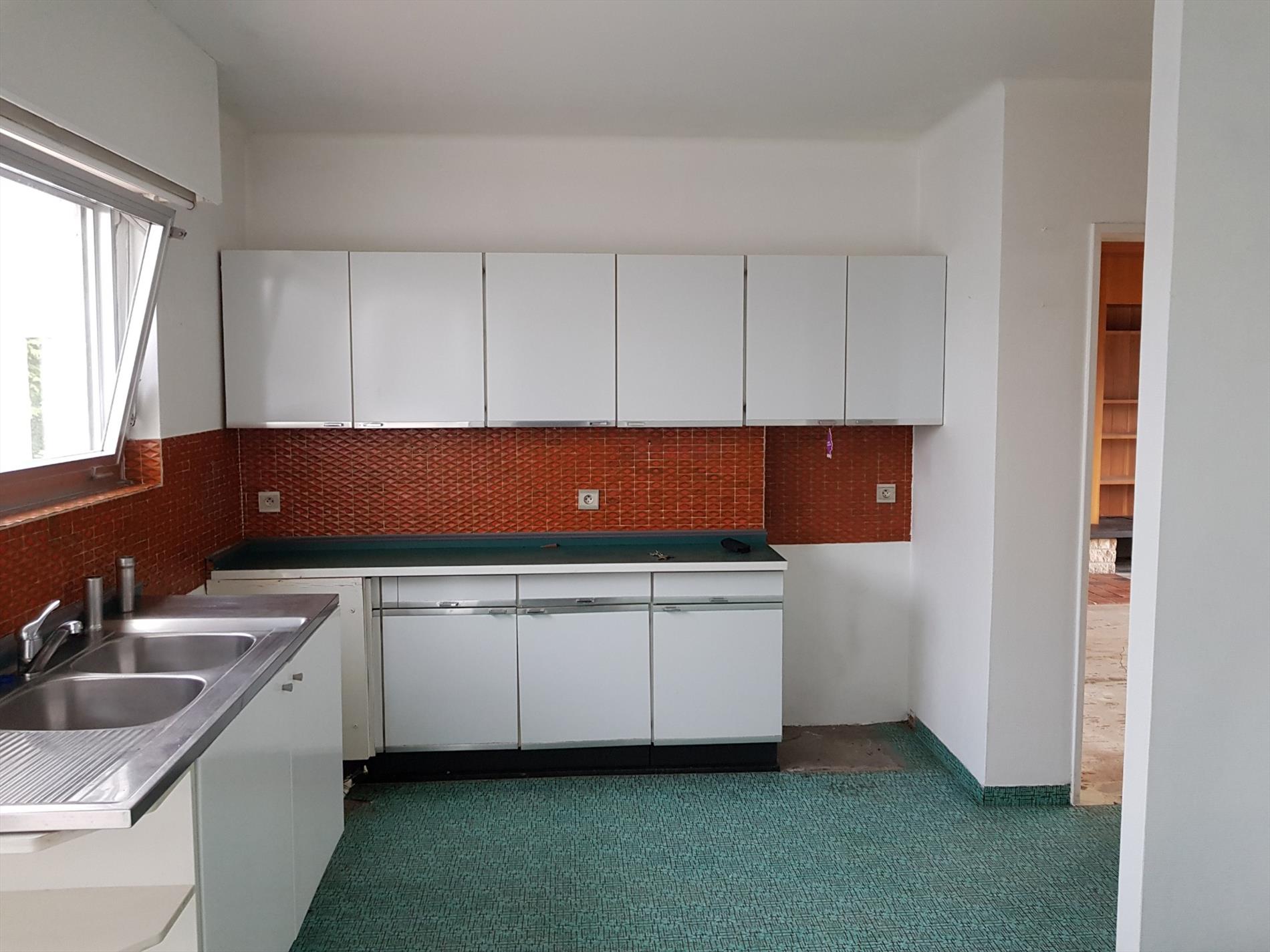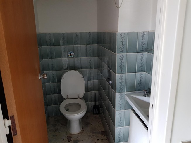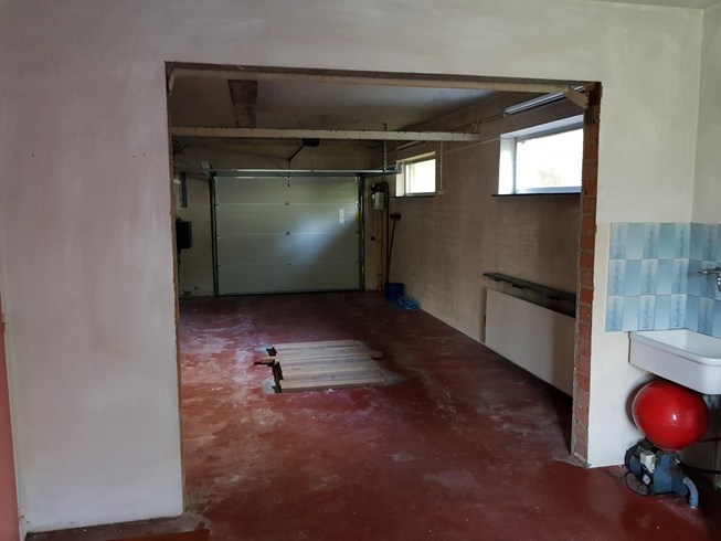 Een gesloten keuken ( 11.50m²) , een garage ( 40 m² : 3.50m x11m ) een apart Wc en een hall ( 9 m² ) met open trap .