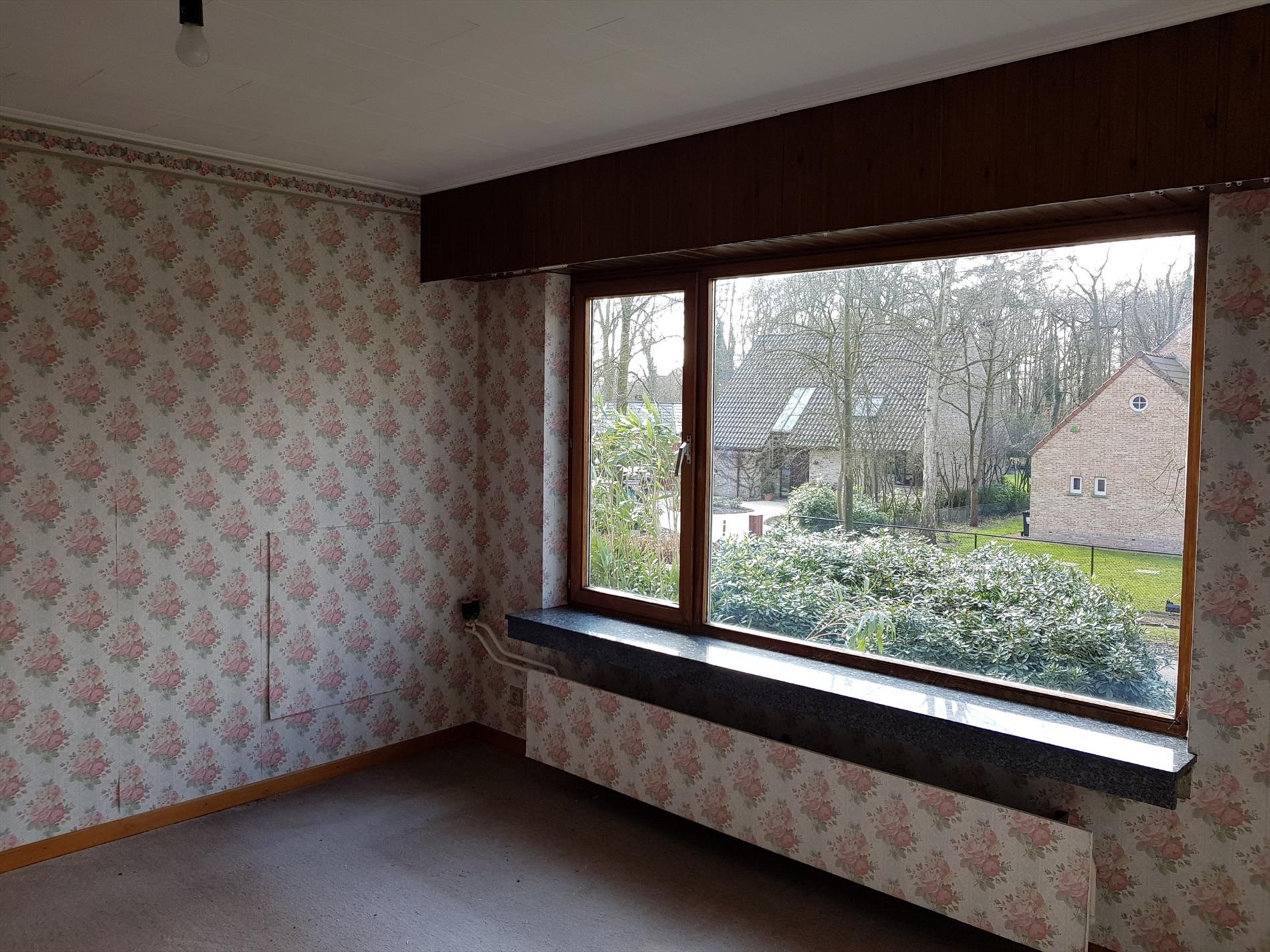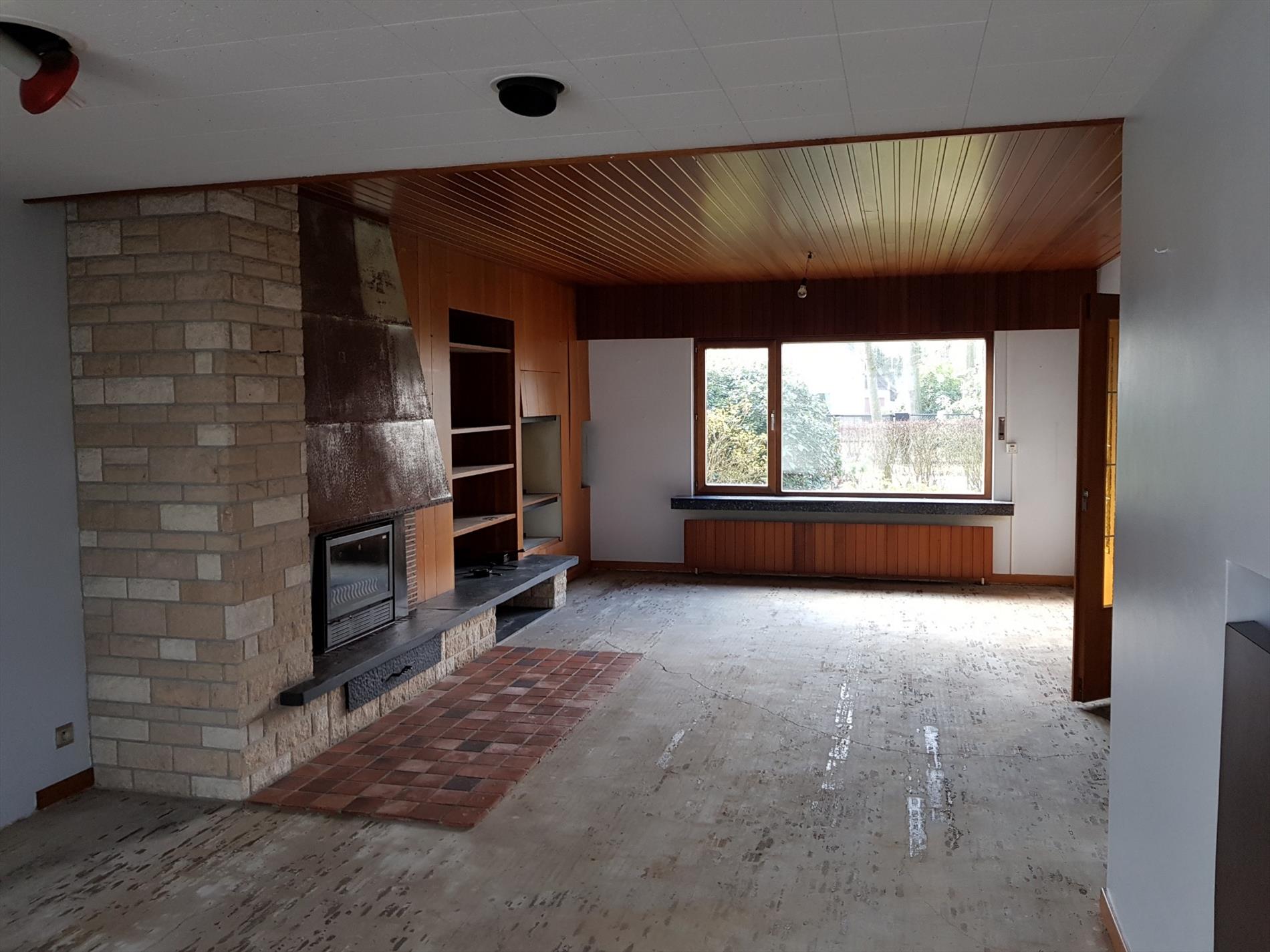 Een leefruimte ( 40 m²) open haard cassette en achterliggende veranda (20 m²) met zicht op de volwassen tuin.