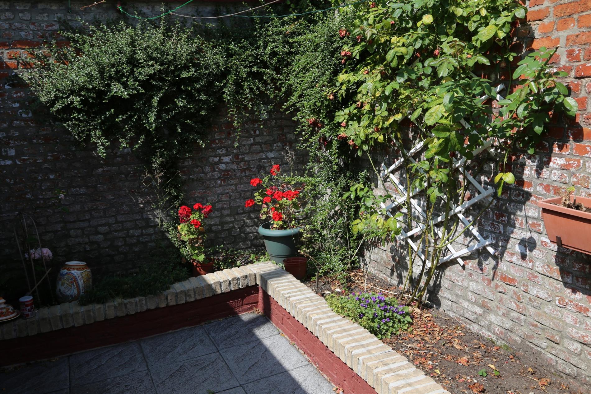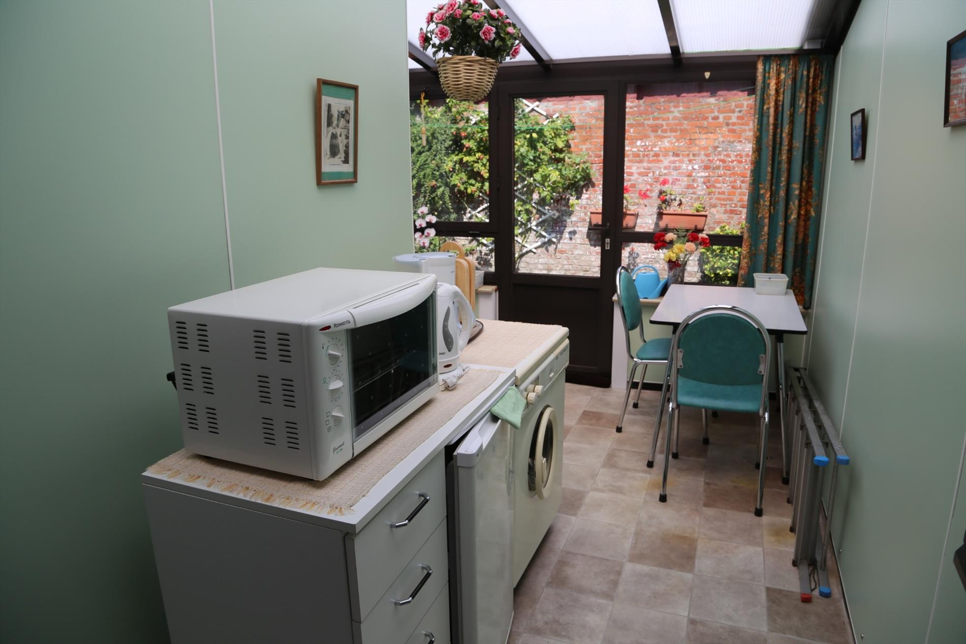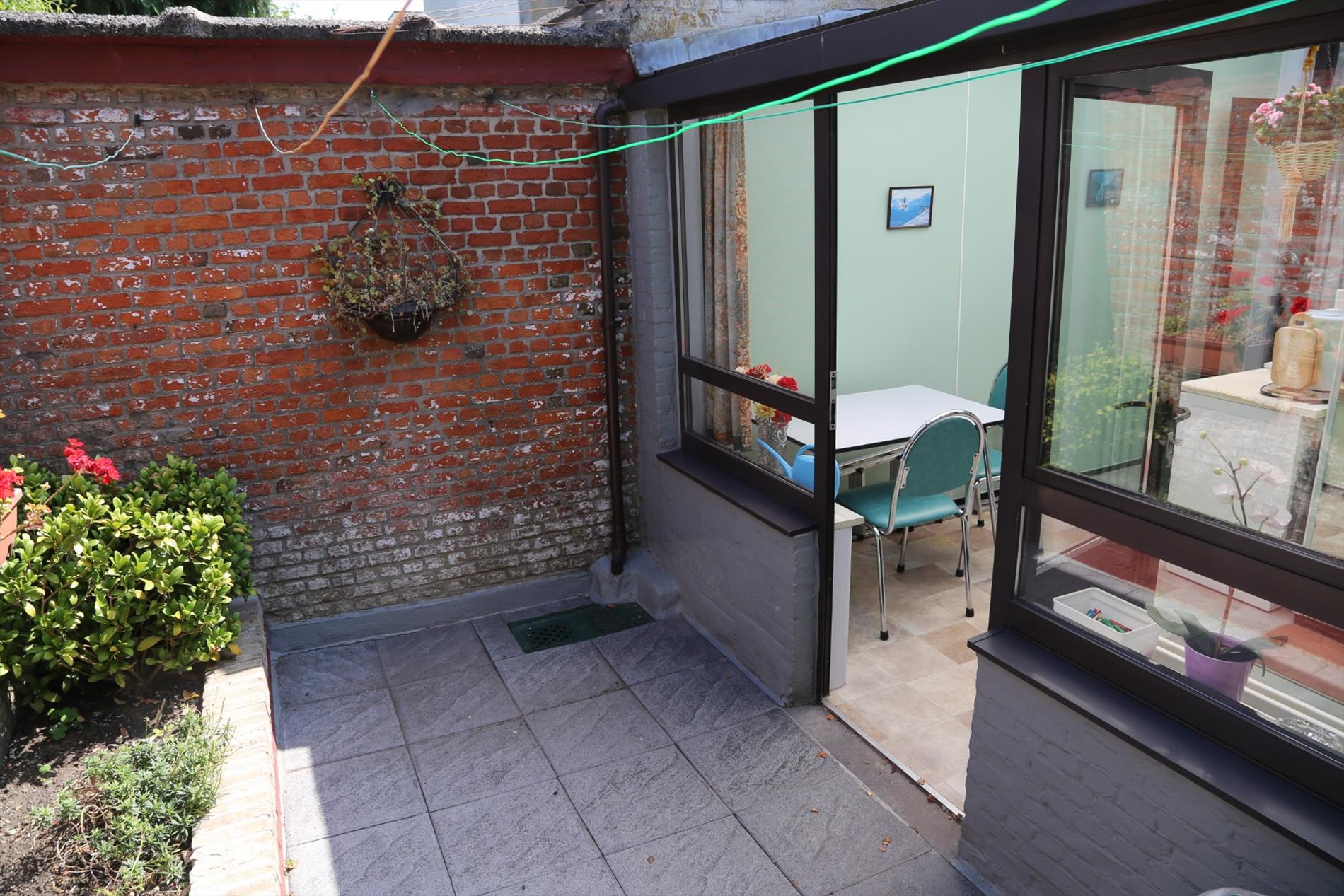 Het huis heeft een inkomhal die uitkomt in de woonkamer en doorloopt naar de eetkamer en de keuken/veranda. De keuken moet volledig naar hedendaagse normen worden omgebouwd. Het potentieel om hier een moderne en leuke ruimte van te maken is er zeker ! Achter de keuken zijn zowel een toilet als een extra bergruimte voorzien. In de veranda is er een aansluiting voor de wasmachine. De knusse stadstuin/koer kan worden vergroot indien gewenst. Zij nodigt zeker uit om buiten te zitten en te genieten.