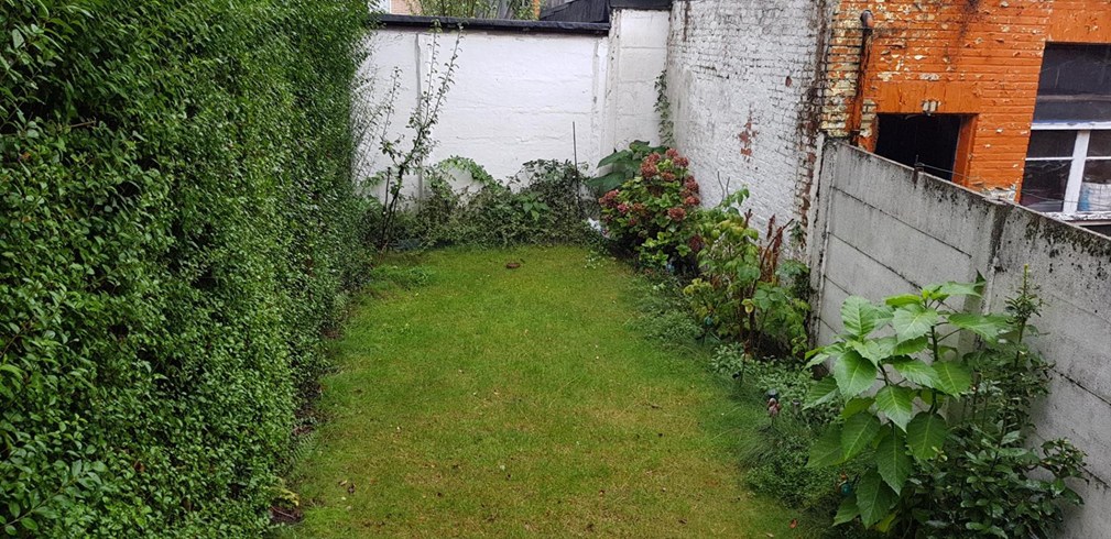 Een leefruimte ( 28m² ) met trap naar de stadstuin ( 44 m² ).