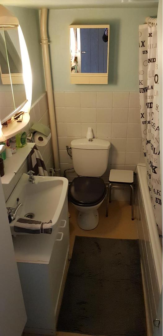 Om het gelijkvloers een gesloten, aparte ingerichte keuken (10 m² ), de verzonken badkamer met ligbad, wc en lavabo.