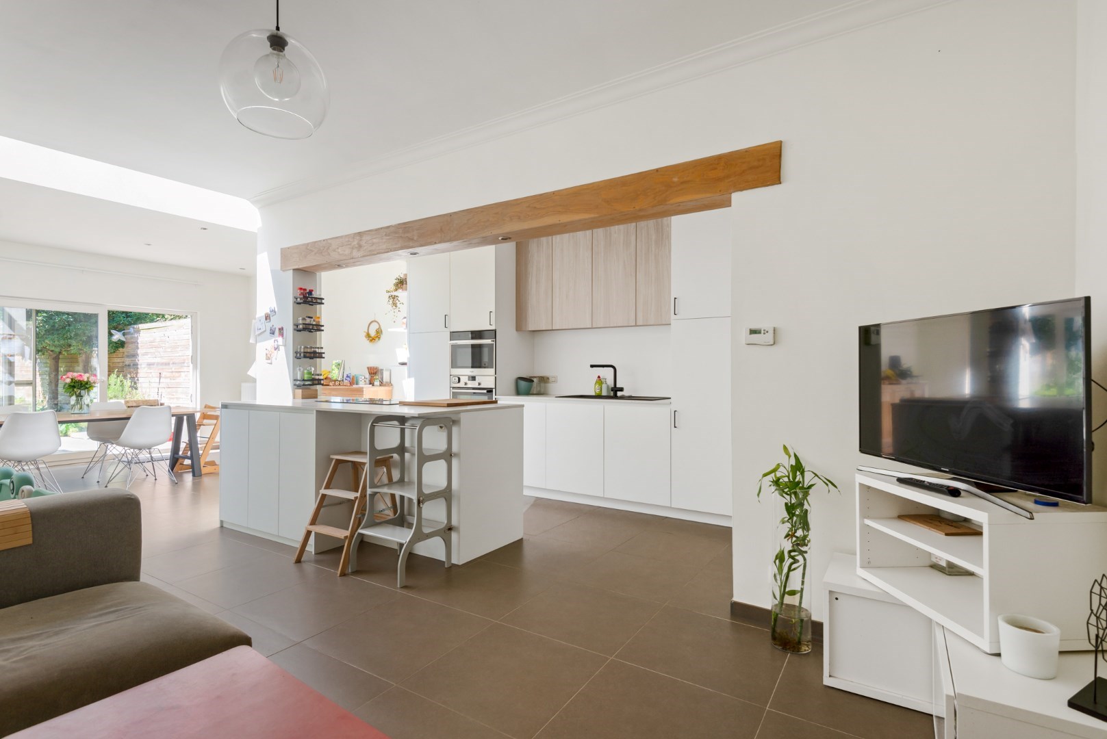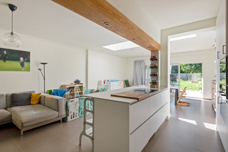 Een mooie en grote leefruimte met moderne open keuken ( 63 m² samen ).