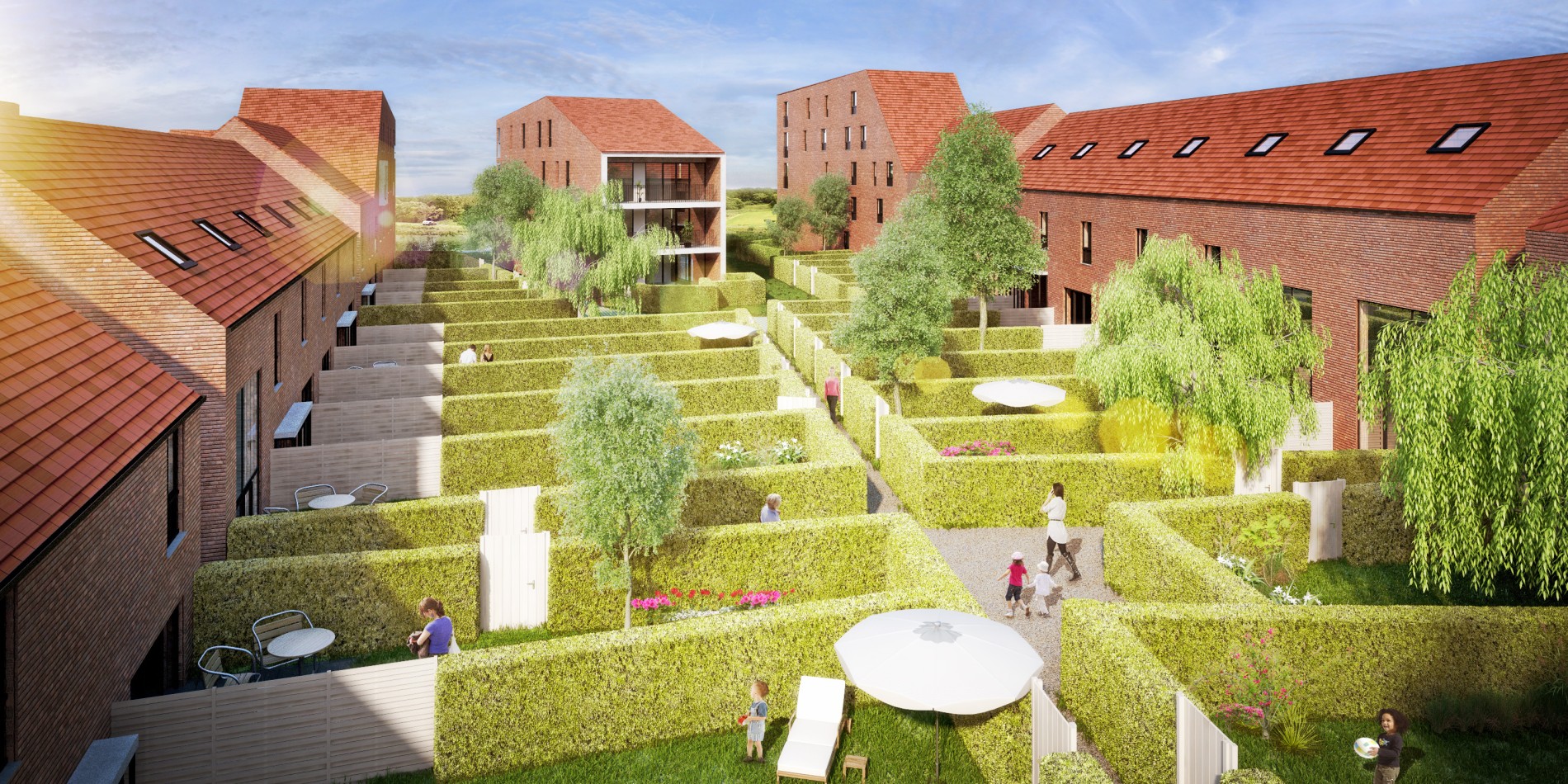 TE KOOP - In eerste fase worden er 19 gezinswoningen te koop aangeboden. De woningen met tuin bevinden zich centraal op de site. Er is steeds een vaste trap voorzien naar de zolder, die nog kan ingericht worden als extra slaap- of hobbykamer. (Prijs excl. btw) EPB 60 kWh/m². Oplevering wordt voorzien in de zomer van 2016.