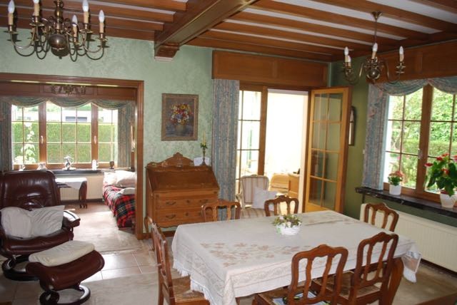 TE KOOP: deze open bebouwing bevindt zich in een rustige en groene omgeving en werd steeds goed verzorgd door de huidige eigenaars, docht dient de woning gemoderniseerd te worden. De woning is als volgt ingedeeld: inkomhal, toilet, woonkamer met zithoek en veranda met zicht op de grote tuin met tuinhuis. Eveneens voorzien van een ingerichte keuken ( keramische kookplaat, oven, koelkast en diepvries) en badkamer (douche en wastafel). Op de bovenverdieping treft u een nachthal, 3 slaapkamers (13 m², 12 m² en 9m²) en apart toilet. De woning is al deels voorzien van dubbele beglazing en rolluiken. Het terras beschikt eveneens over een zonneluifel. Grenzend aan de woning bevindt zich een ruime garage (25 m²) met aansluiting voor wasmachine en droogkast. Deze woning is zeker uw bezoek waard! EPC: 794 kWh/m²/jaar.