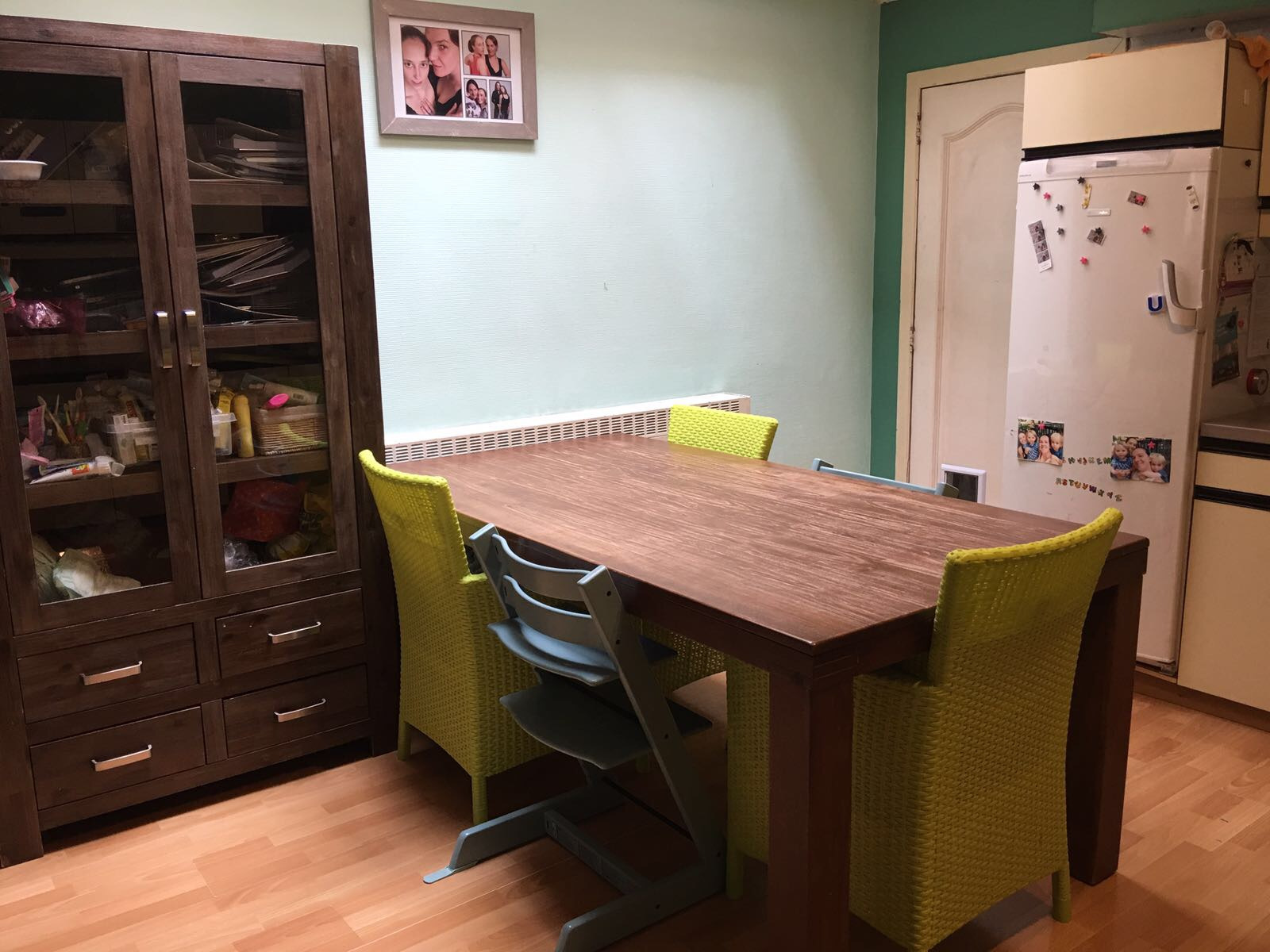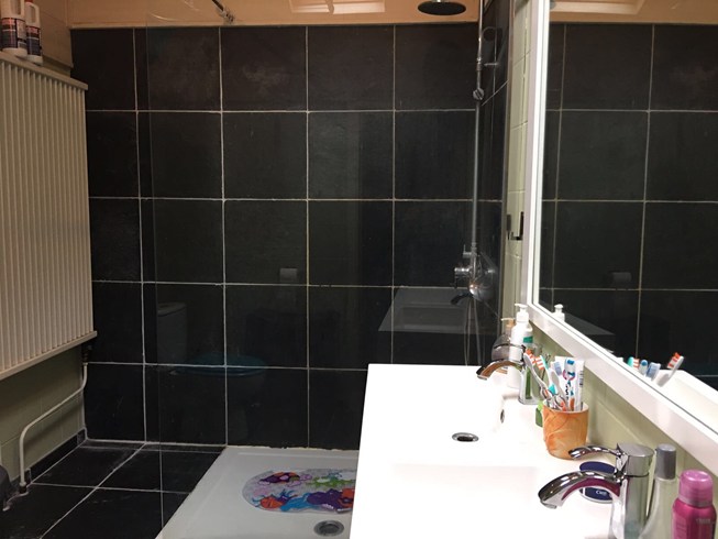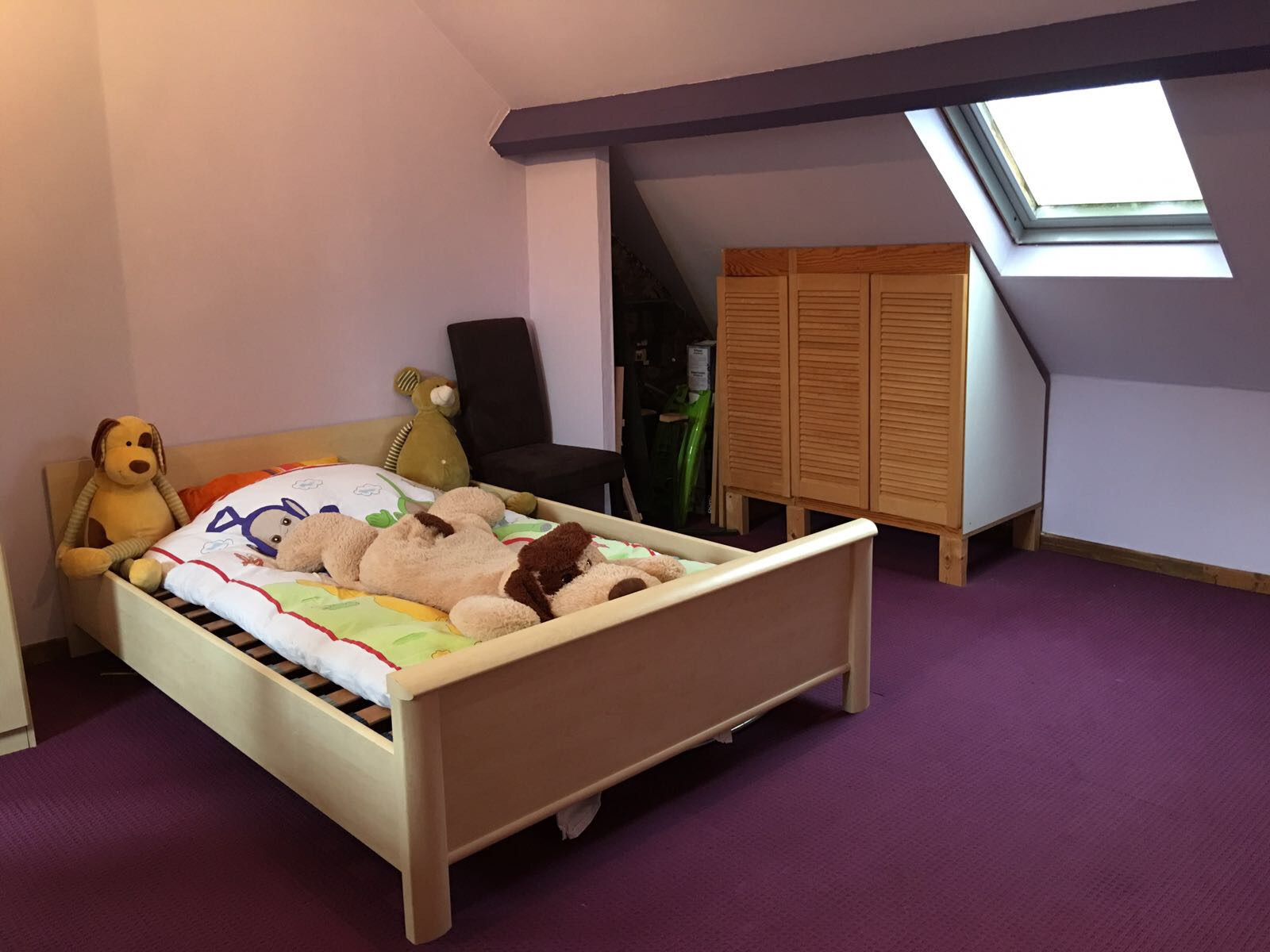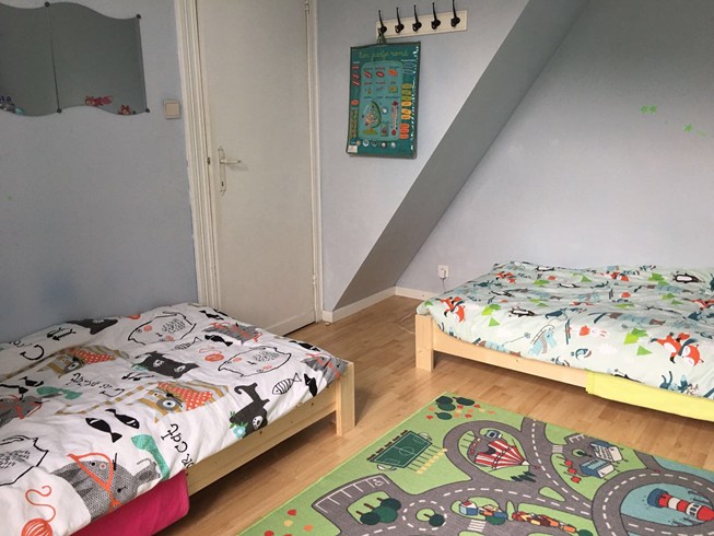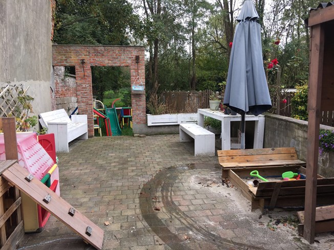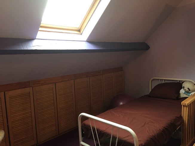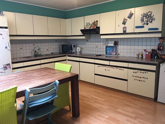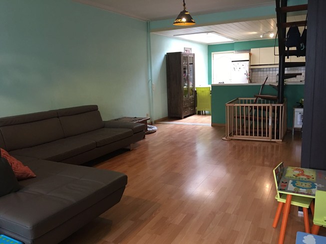 Deze leuke woning heeft een jonge uitstraling : je ziet de kinderen hier rondlopen....Er is een ruime living met een aangrenzende keuken, uitmondend aan een aangelegd terras en een mooi grasperk als tuin. Hiertussen staat ook nog de badkamer met inloopdouche en dubbele lavabo. De trap staat in de living en leidt naar de ruime voorste slaapkamer en aangrenzend de kinderkamer. Er is eveneens een vaste trap naar de tweede verdieping waar een ruime zolderkamer nog mogelijkheid geeft om 2 personen te laten slapen. De ramen zijn vernieuwd en de structuur is in orde, doch de woning heeft een opfrisbeurt nodig. Klein beschrijf