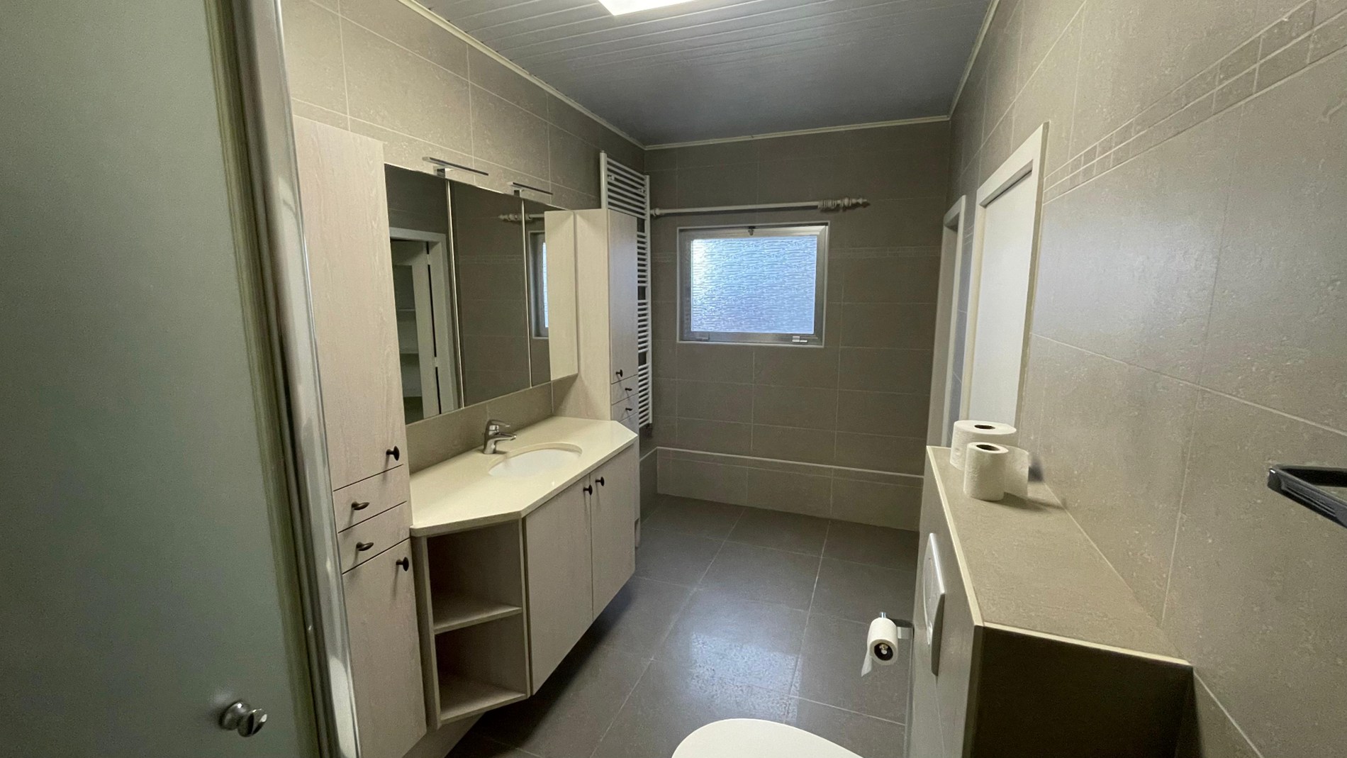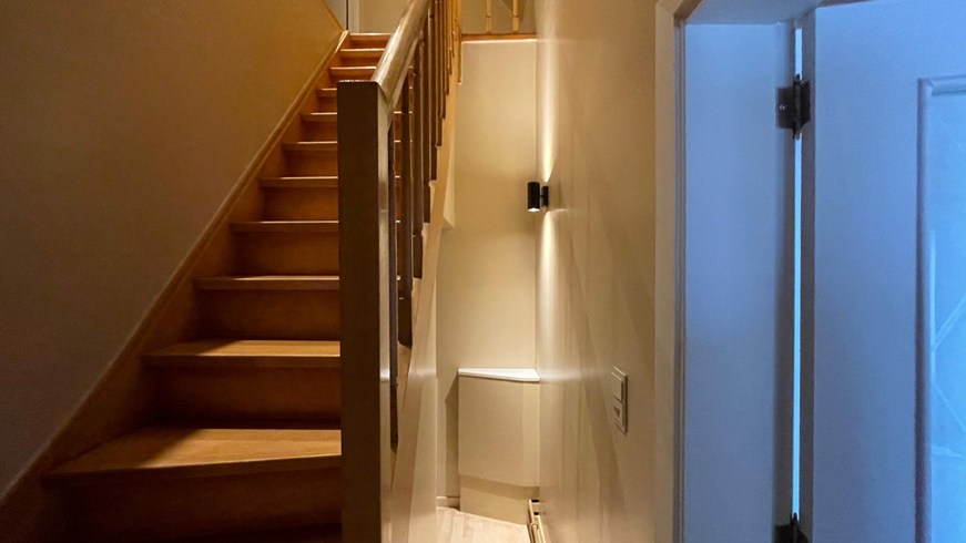 Je komt binnen via de ruime inkomhal die uitgeeft op de technische ruimte, de trap naar het eerste verdiep en de woonkamer. De woonkamer geeft dan weer uit op de moderne badkamer en keuken die op haar beurt toegang geeft tot de veranda en tuin.