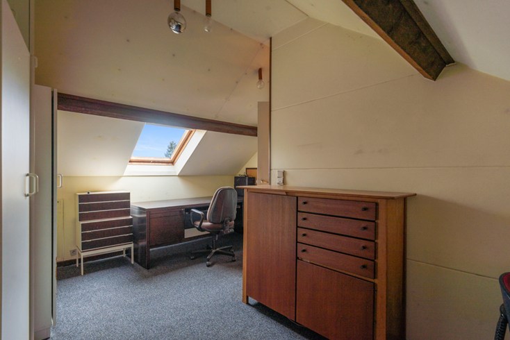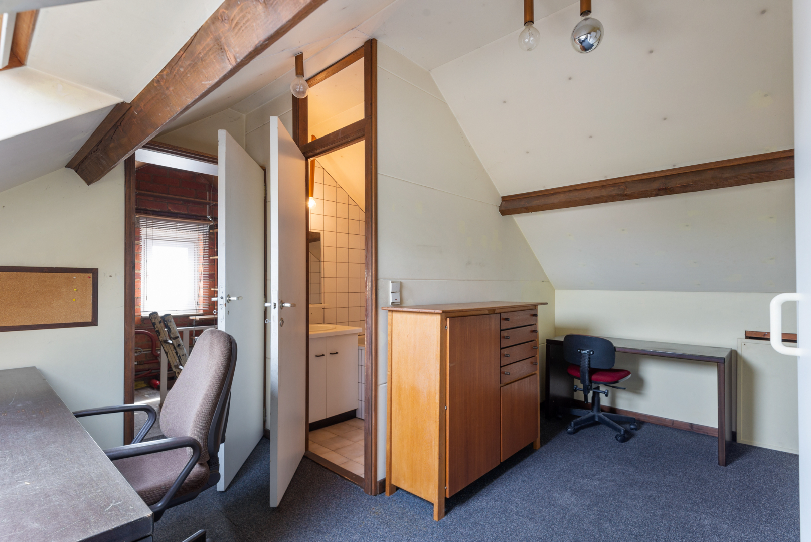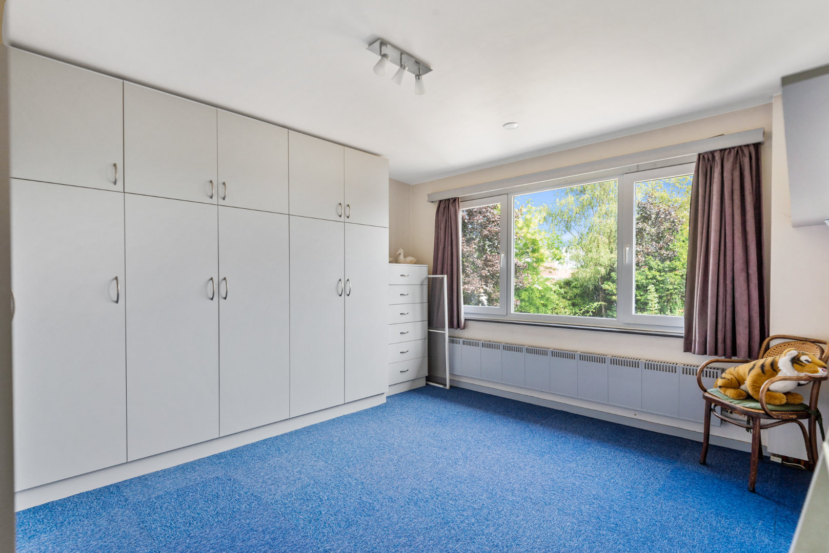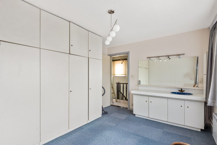 Op de eerste verdieping zijn er drie slaapkamers ( 2 normale en 1 kleine) en mits het zetten van een trap is er nog een slaapkamer en badkamer op de zolder. Boven de garage vooraan zou je nog makkelijk een slaapkamer kunnen maken. Ruime garages en berging achteraan in de tuin, alsook aangrenzend aan het huis. Altijd zon, altijd schaduw in de ruime tuin. Ideale woning voor een jong gezin. Een huis voor hobby's of mancave, of voor groene vingers. Het dak is al geïsoleerd en de dubbele muren laten ook spouwmuurisolatie toe.