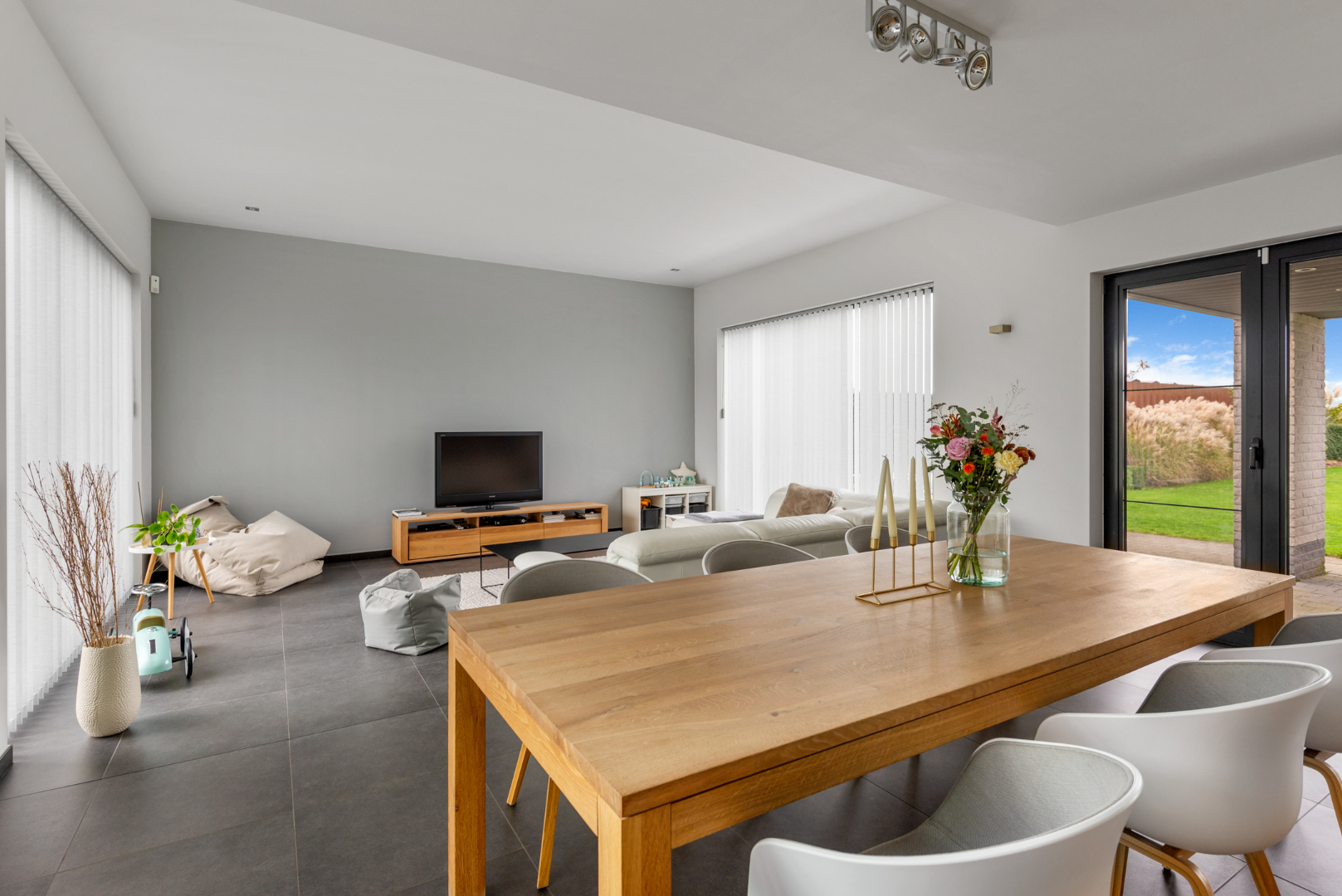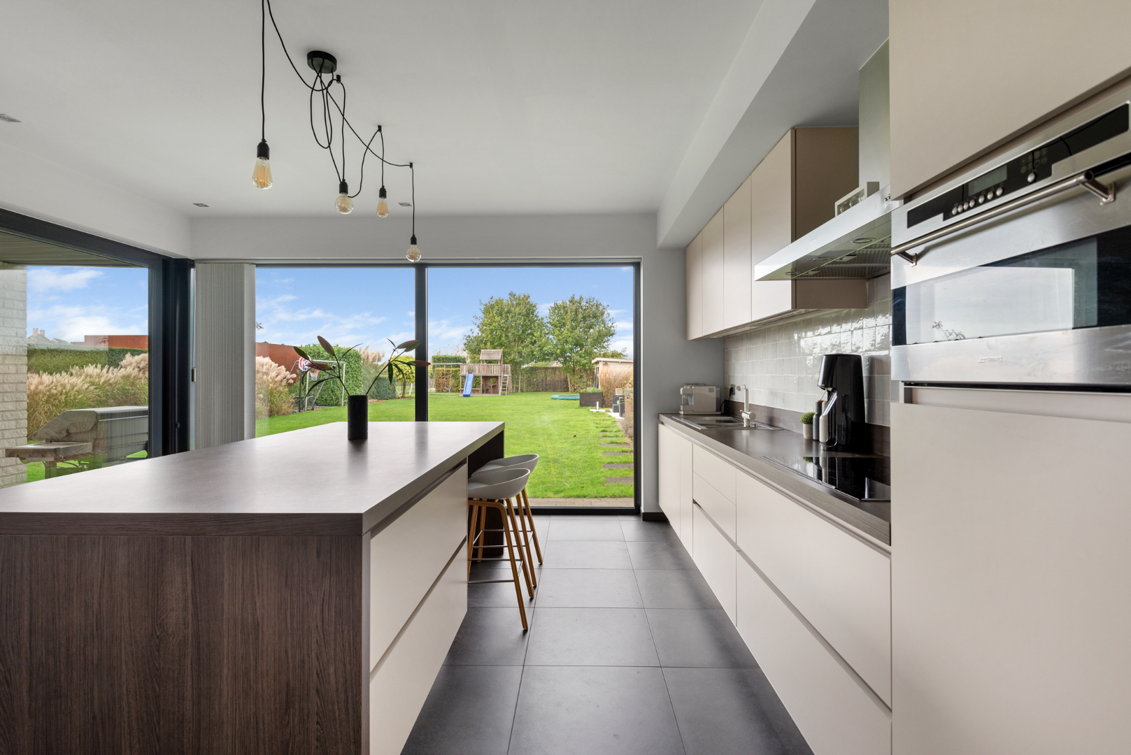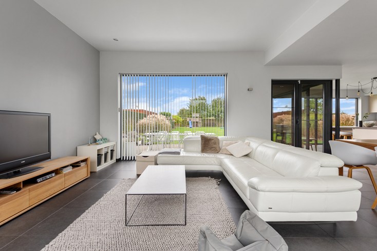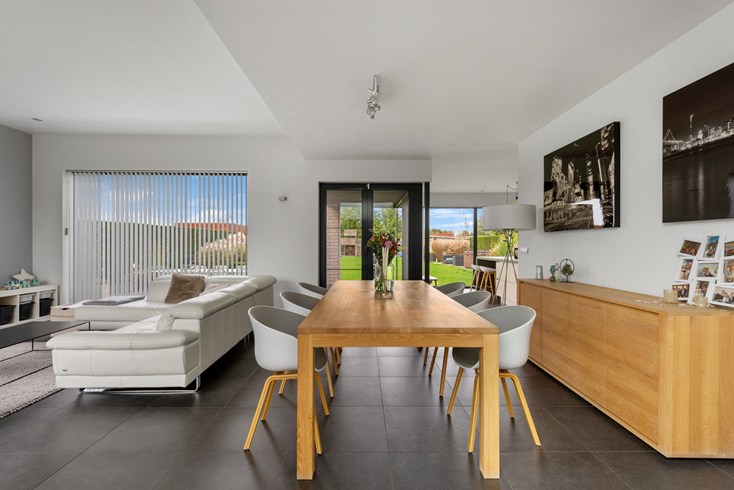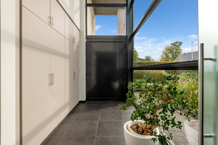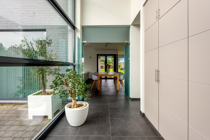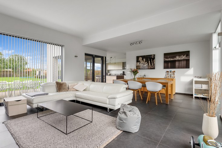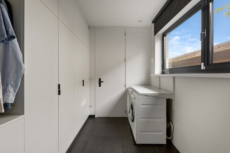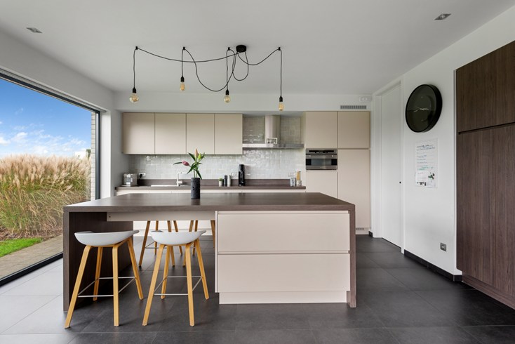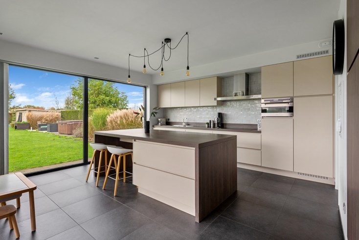 De grote inkomhal met vide geeft toegang tot de leefruimte alsook naar slaapvertrekken boven én inpandige ruime garage met automatische poort. Grote leefruimte met ingerichte open keuken afgewerkt met hoogwaardige materialen. Heerlijk om hierin te koken en tegelijkertijd de kinderen te zien spelen. De keuken geeft eveneens doorgang naar berging/garage.
