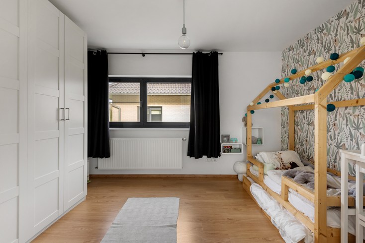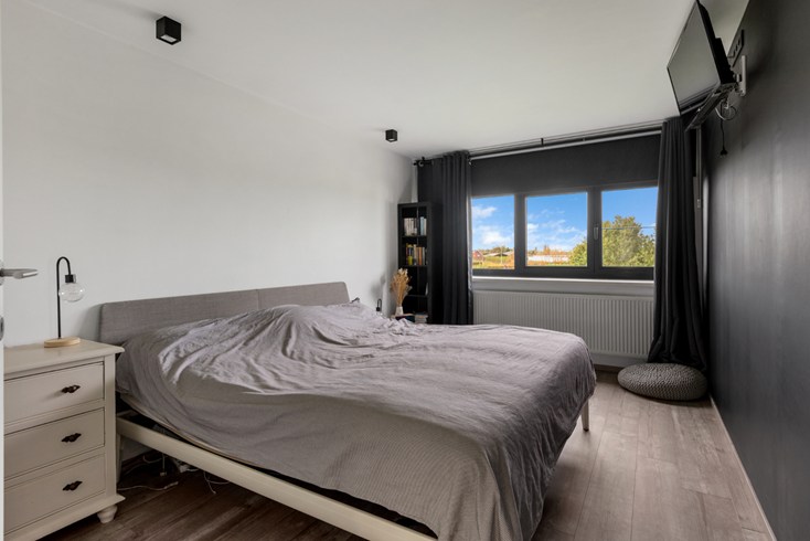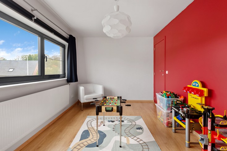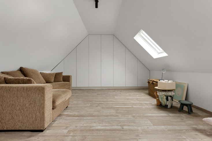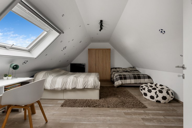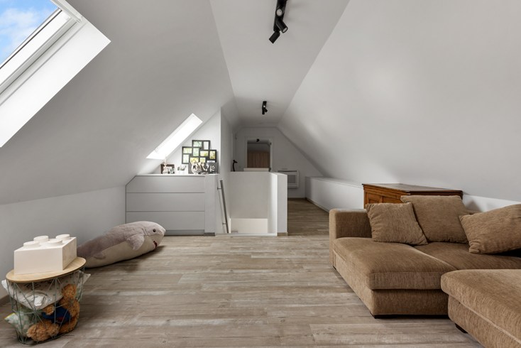 Onder het dak bevindt zich 1 ruime slaapkamer en een grote speelruimte die eventueel om te vormen is tot een extra slaapkamer.