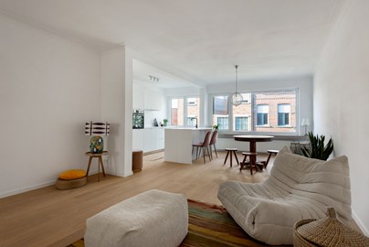 Dit volledig vernieuwd appartement op de eerste verdieping is met hoge standaard verbouwd . Het is een deel van een klein appartements blokje van 3 units . Een living met groot raamoppervlak (licht ) en open keuken met kookeiland . Deze keuken is volledig en compleet uitgerust met Siemens toestellen . Het beschikt over 2 slaapkamers ( 14 m² en 9 m² ) . Een klein terrasje aan de achterzijde met zicht op groen . Een prachtige badkamer met inloop douche en lavabo . Een apart toilet en kleine berging /technische ruimte ( wasmachine ). …